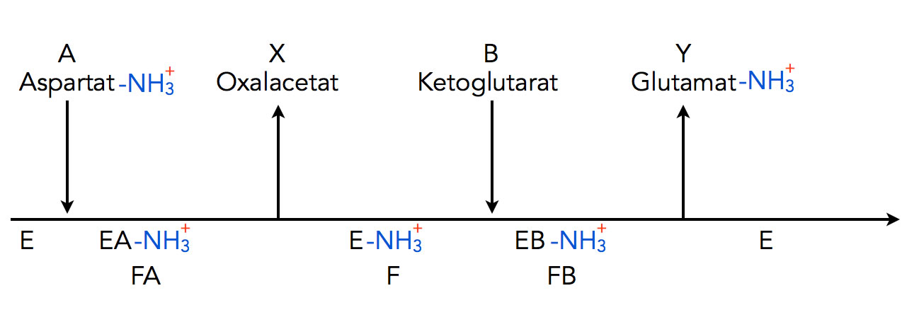 In der Pingpong-Reaktion, die auch als doppelte Verdrängung bezeichnet wird, gibt es keinen ternären Komplex als Zwischenprodukt der enzymatischen Reaktion. Vielmehr wird das Enzym E selbst verändert, es ensteht ein enzymatisches Zwischenprodukt, das wir hier einfach mal als F bezeichnen. Ein schönes Beispiel für eine solche Pingpong-Reaktion ist die Übertragung einer Aminogruppe von Aspartat auf alpha-Ketoglutarat. Diese Reaktion sieht im Cleland-Schema folgendermaßen aus: