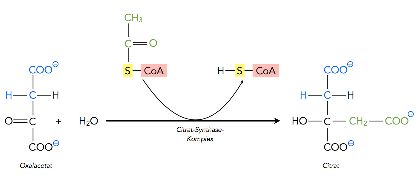 Hier sehen wir den ersten Schritt der nächsten Runde des Citratzyklus. Das regenerierte Oxalacetat nimmt wieder einen Acetylrest auf, der vom Coenzym A angeliefert wird.