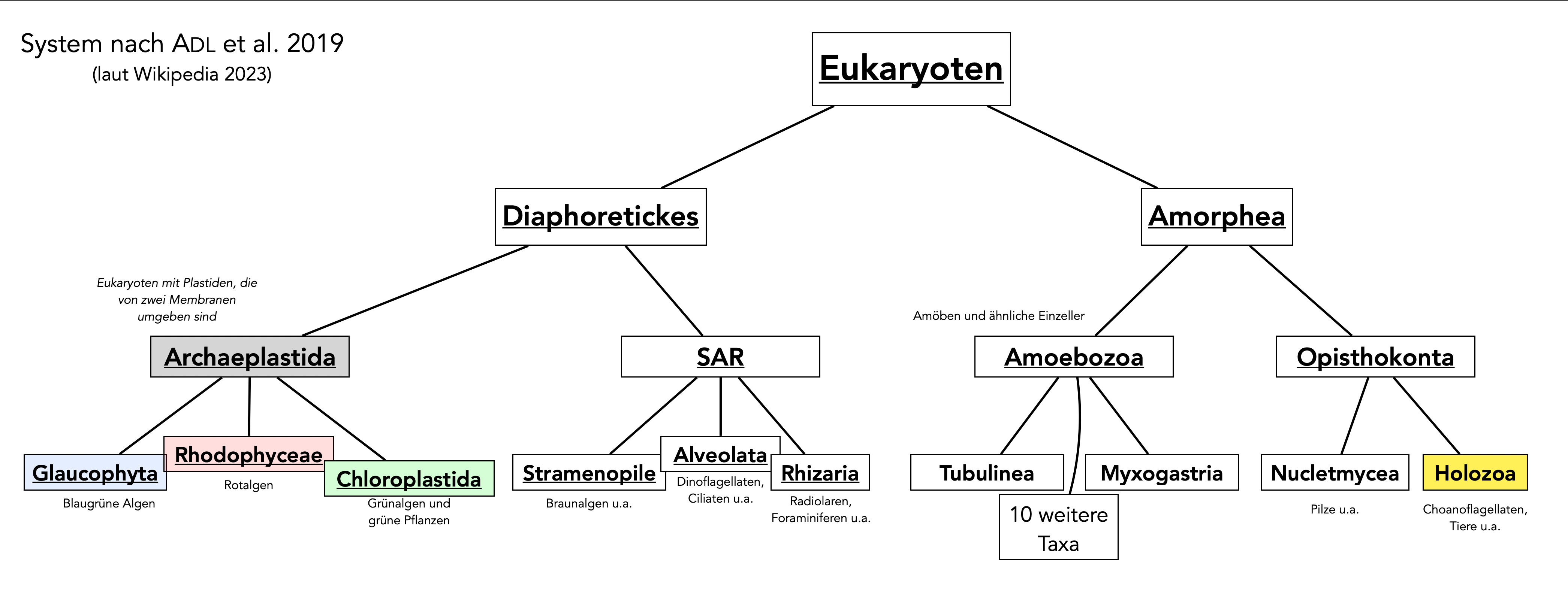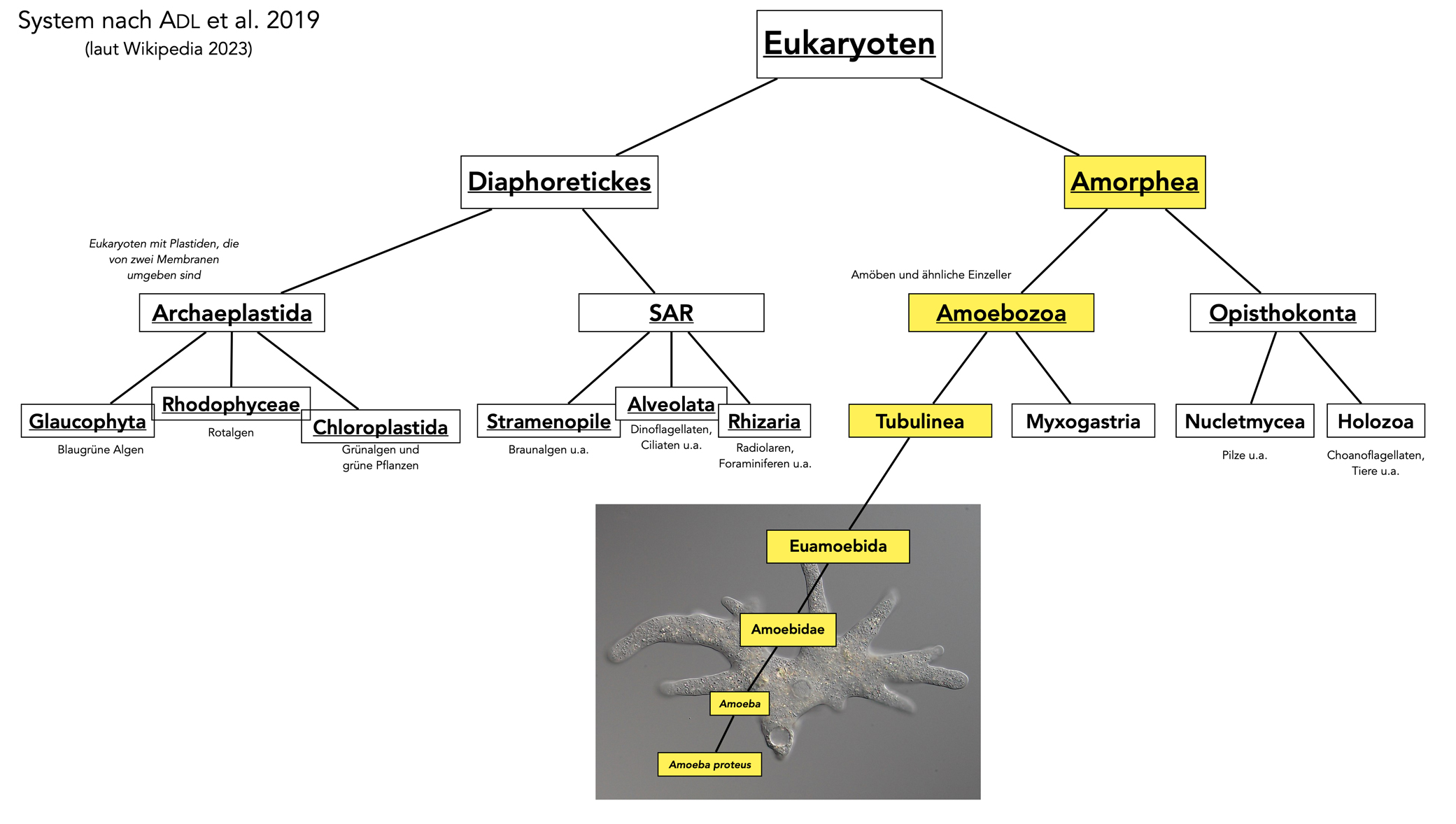 Die Amoebozoa und die Opistokonta bilden zusammen das Taxon der Amorphea, und dieses Taxon bildet dann zusammen mit den Diaphoretickes die Eukaryoten.