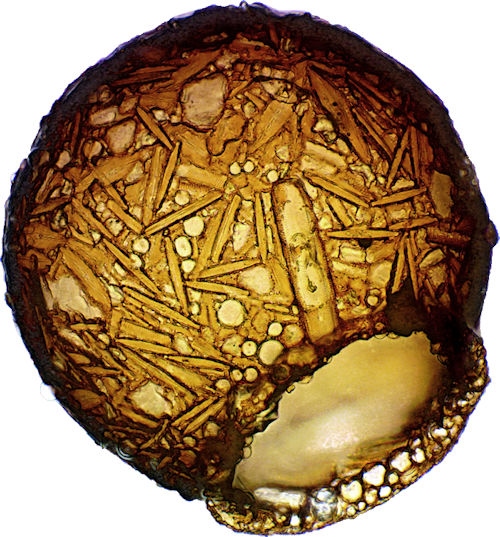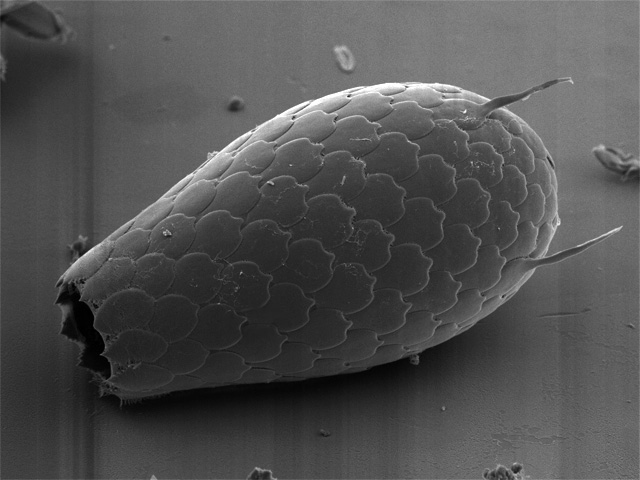 Auf diesem Bild sieht man das Gehäuse einer Euglypha-Art mit zwei Stacheln. Je nach Form des Gehäuses werden die ca. 40 Euglypha-Arten in drei Gruppen unterteilt:
