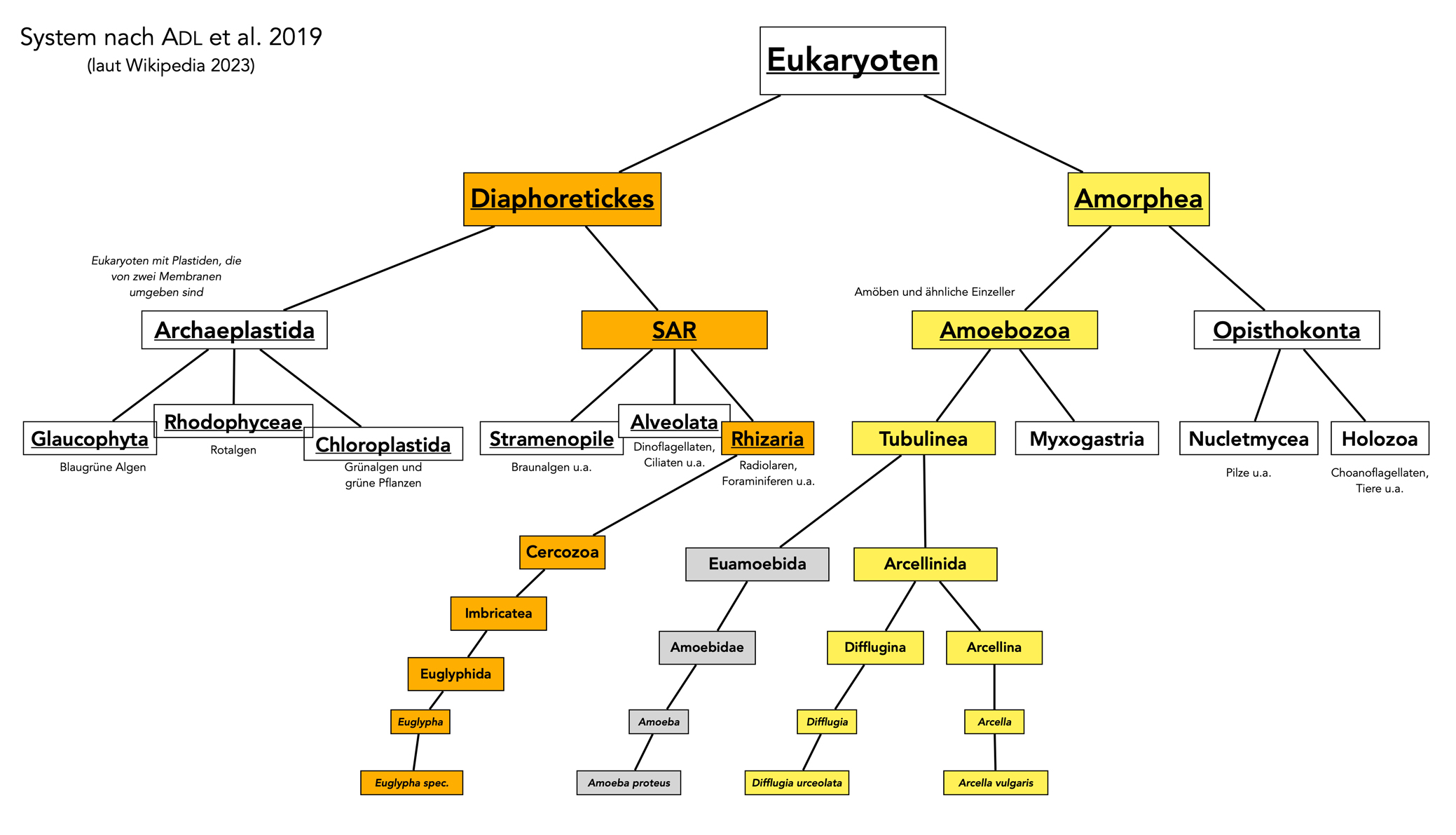 Dieses Schema zeigt die systematische Stellung der drei auf dieser Seite besprochenen Thecamöben-Arten Arcella vulgaris, Difflugia urceolata und Euglypha rotunda. Zum Vergleich wurde auch die Stellung der Amöbe Amoeba proteus mit eingetragen. Man sieht sofort, dass die "normalen" Amöben, wie man sie aus jedem Schulbuch kennt, und die beiden Testacea Arcella vulgaris und Difflugia urceolata einen gemeinsamen Vorfahren haben, da sie beide dem monophyletischen Taxon Tubulinea angehören (grau bzw. gelb markiert).