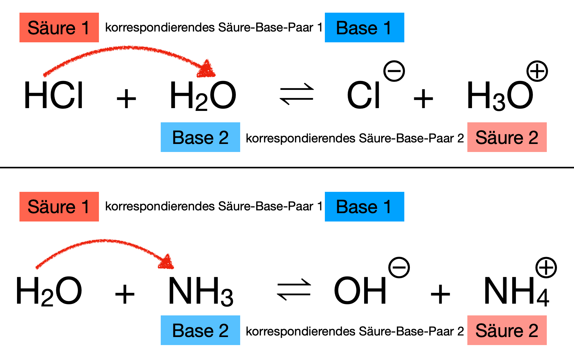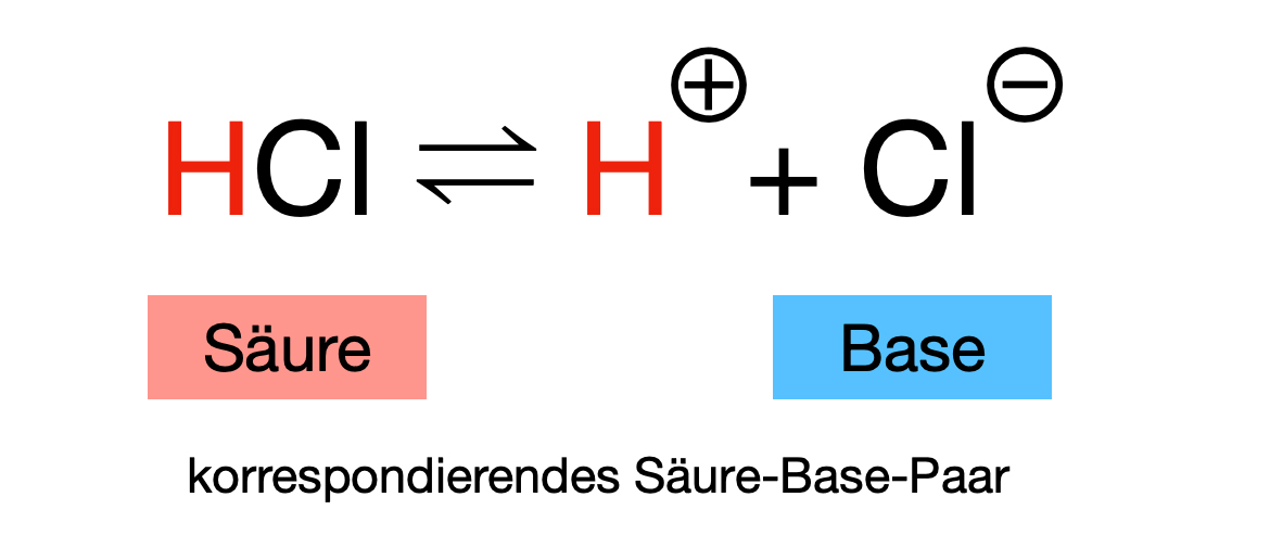 Bei dem Beispiel HCl ist HCl die korrespondierende Säure der Base Cl-, und Cl- ist die korrespondierende Base der Säure HCl.