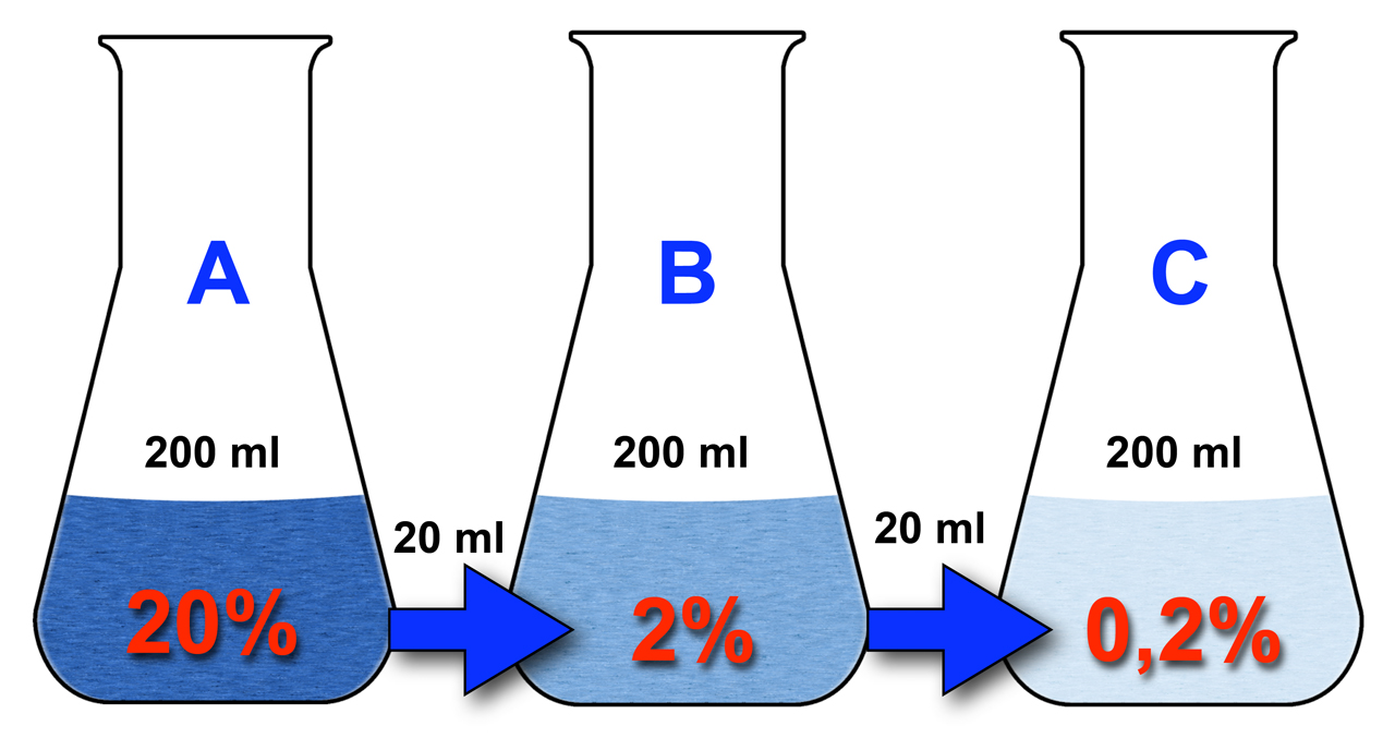 Entsprechend stellen wir in Kolben C eine 0,2%ige saure Lösung her: 20 ml aus Kolben B werden in Kolben C gegeben und dann mit dest. Wasser wieder auf 200 ml aufgefüllt.