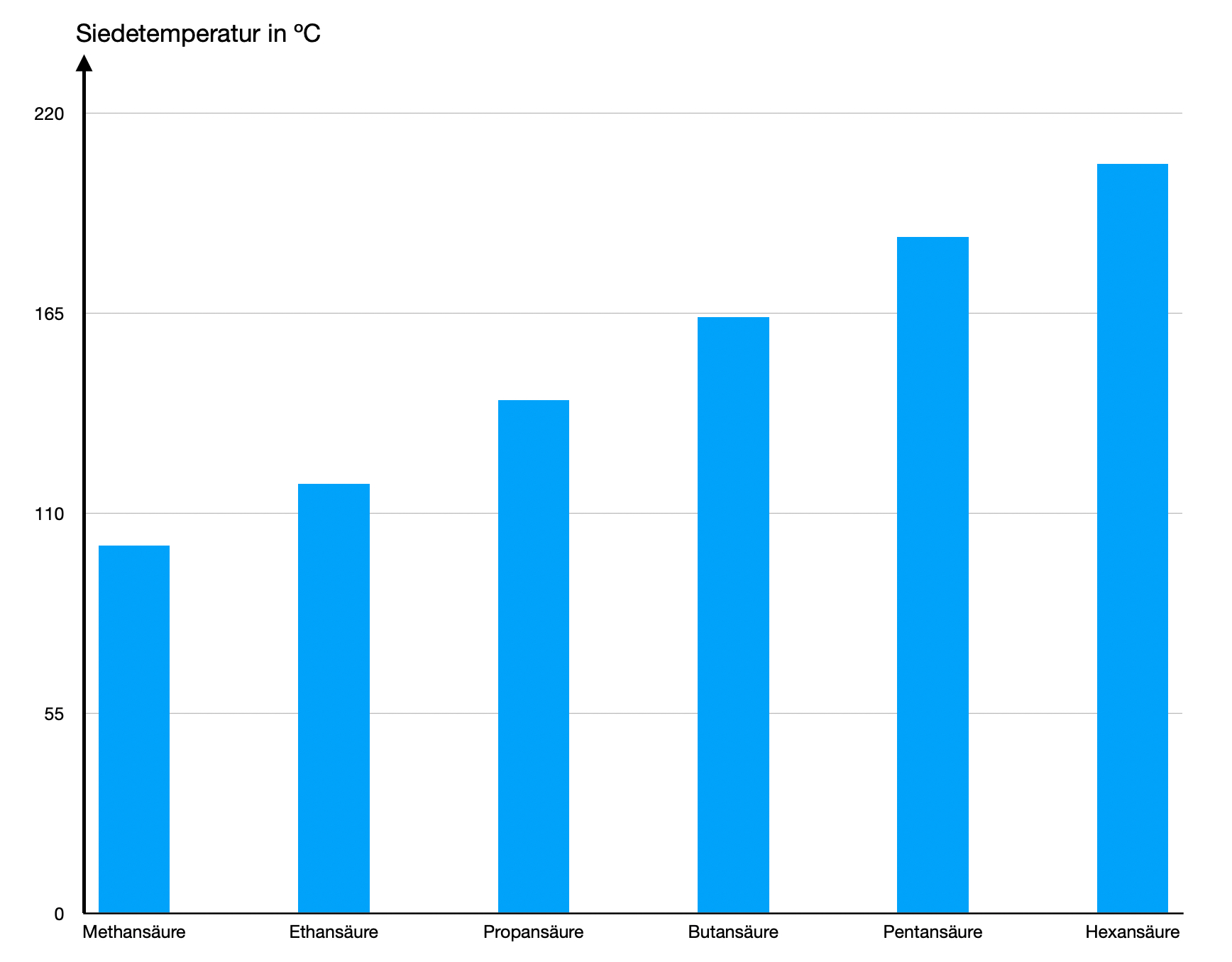 Die folgende Graphik umfasst nur die ersten sechs Alkansäuren, weil sich die folgenden höheren Säuren bei Erhitzung zersetzen, so dass man keine Siedetemperatur mehr feststellen kann: