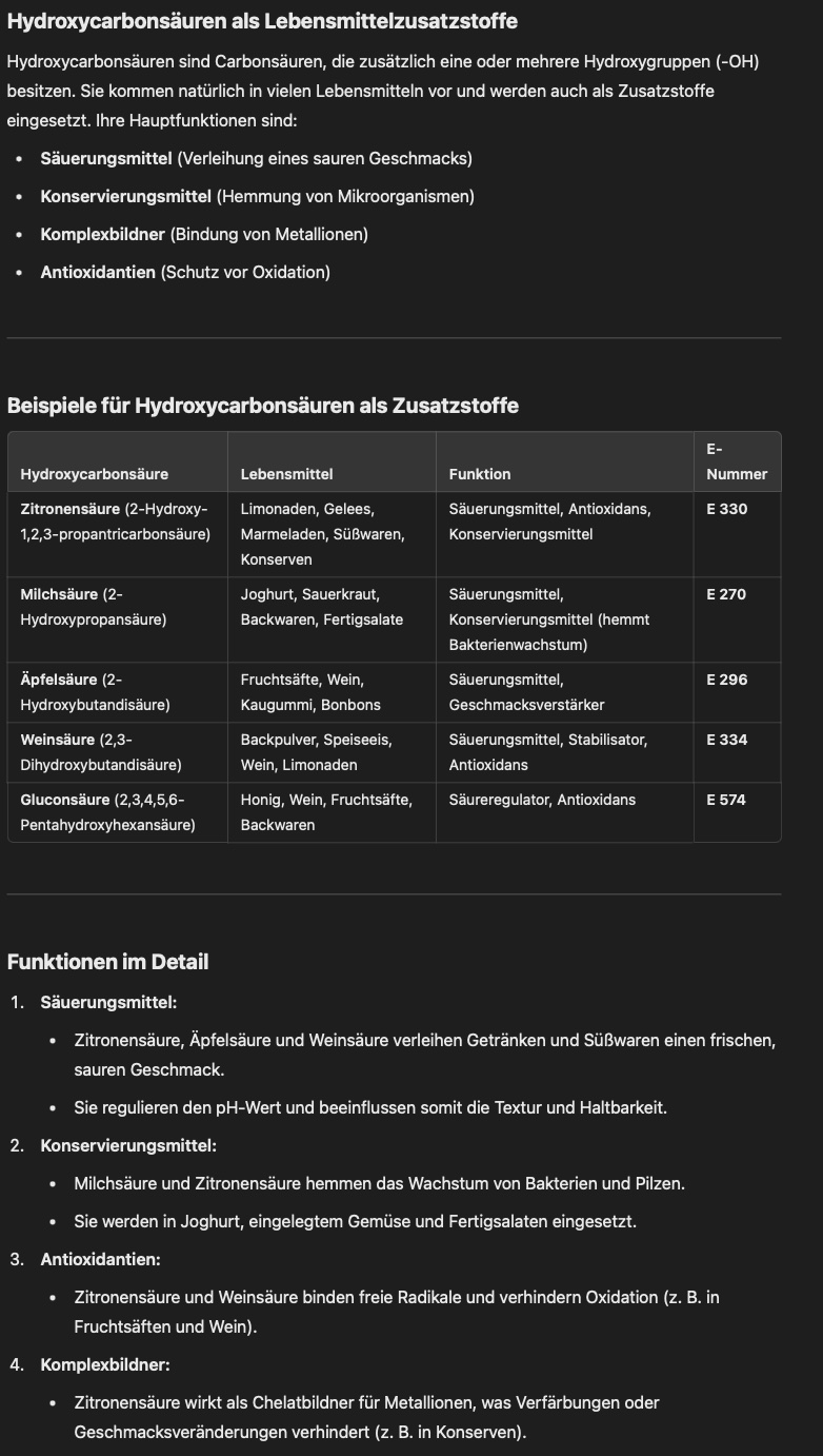 Recherchieren Sie, in welchen Lebensmitteln Hydroxycarbonsäuren als Zusatzstoffe verwendet werden und welche Funktionen sie dort übernehmen.