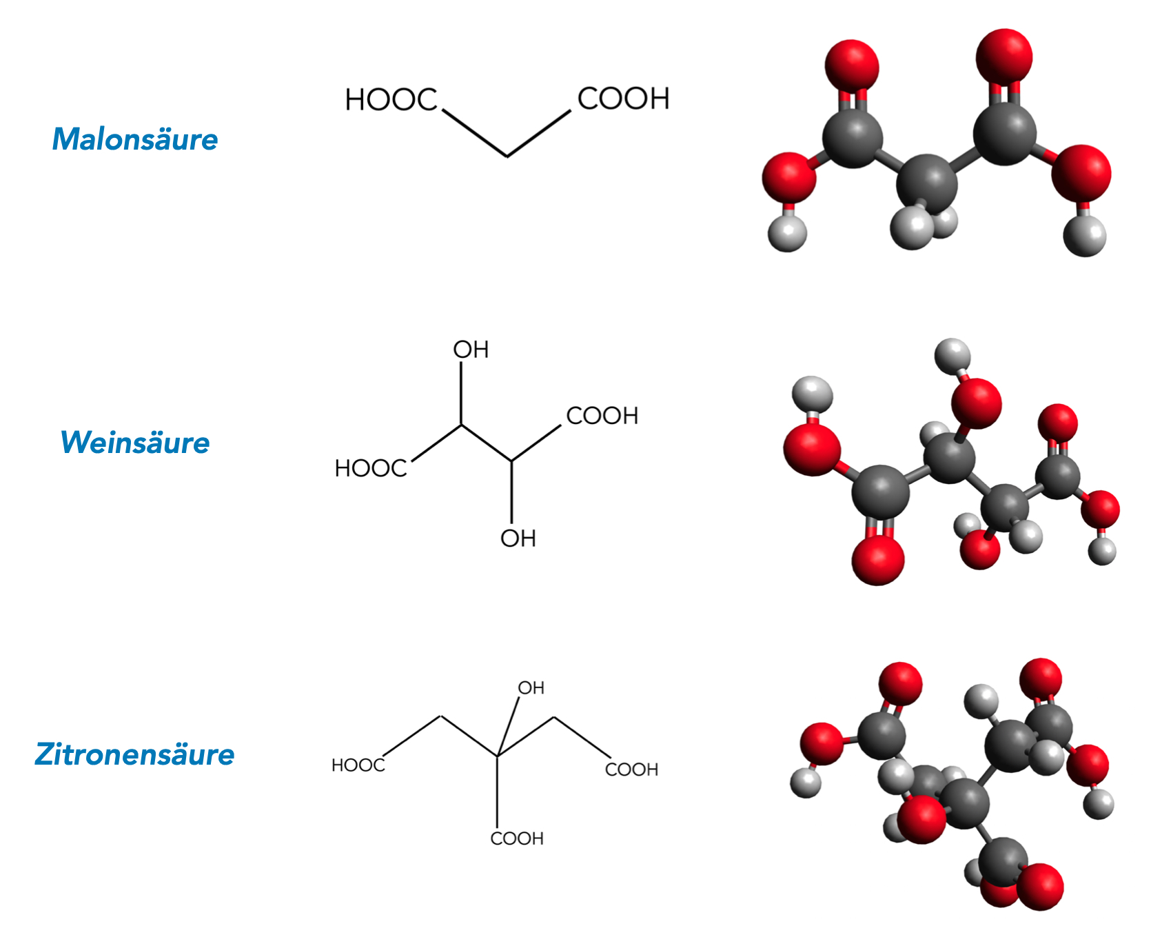Die Strukturformeln der drei Carbonsäuren, ergänzt um Molekülmodelle