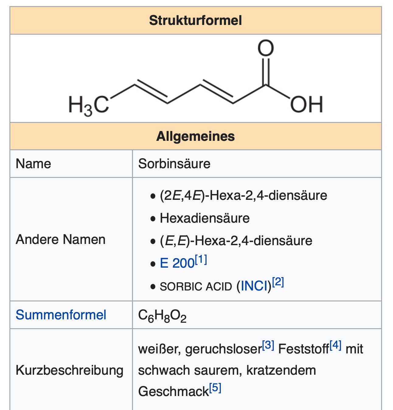 Der in der Wikipedia gezeigte Name "(2E,4E)-Hexa-2,4-diensäure" bezieht sich auf die trans-Stellung der Atom-Gruppen an den beiden C=C-Doppelbindungen, was für die Aufgabe jetzt aber keine Rolle spielt.
