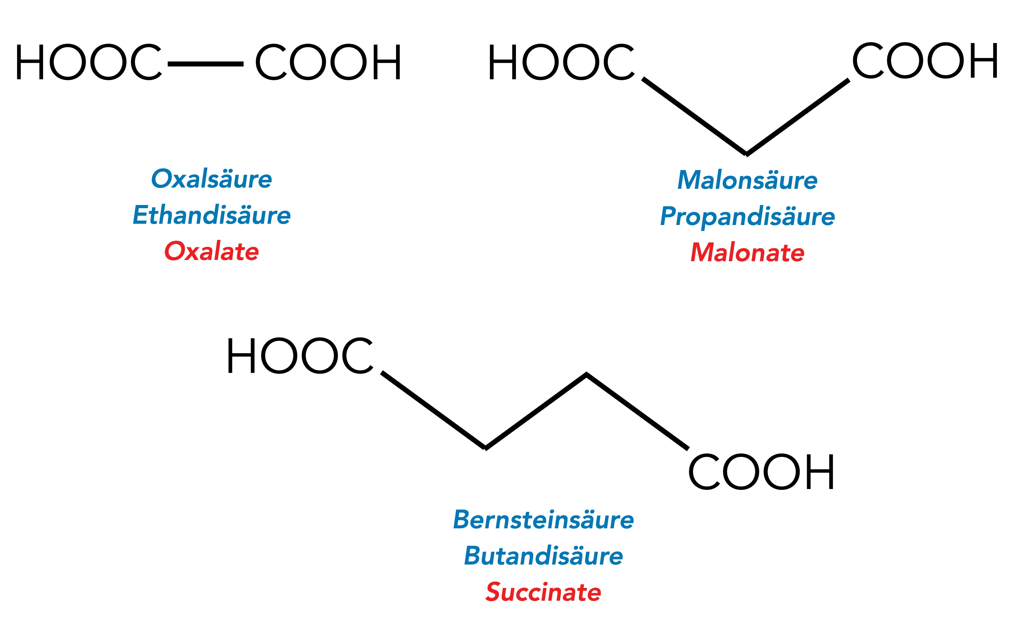 Drei Dicarbonsäuren: Oxal-, Malon- und Bernsteinsäure