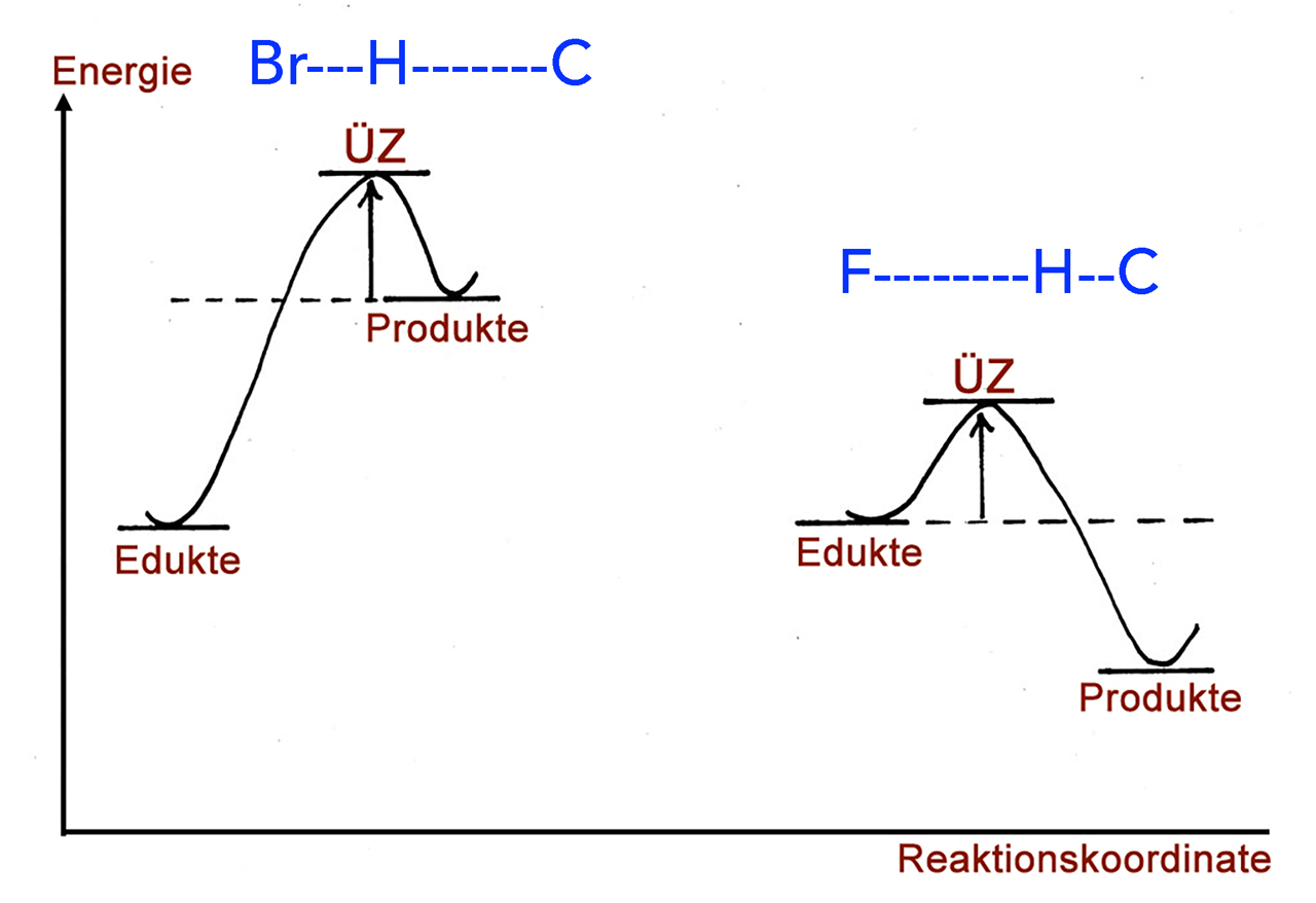 Bei der endothermen Bromierung ähnelt der Übergangszustand Br--H-------C dem Zwischenprodukt •CH3, also dem Methyl- oder Alkyl-Radikal. Bei der exothermen Fluorierung dagegen ähnelt der Übergangszustand F-------H--C weiterhin stark dem Edukt CH4 bzw. dem Alkan-Molekül.