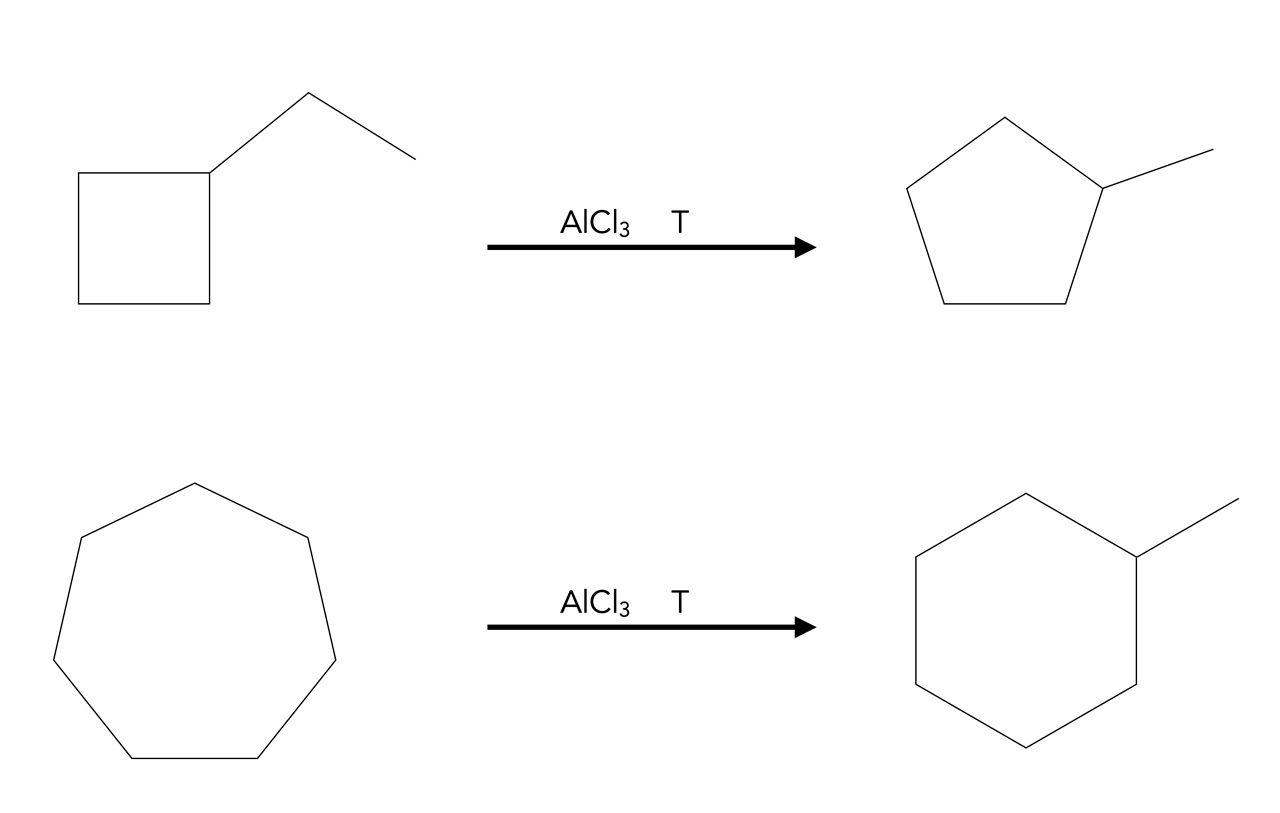 Oben im Bild sehen wir die Reaktion von Ethyl-cyclobutan zu Methyl-cyclopentan, also eine Ringerweiterung. Unten im Bild sehen wir das Gegenteil, eine Ringverengung. Aus Cycloheptan wird Methyl-cyclohexan.