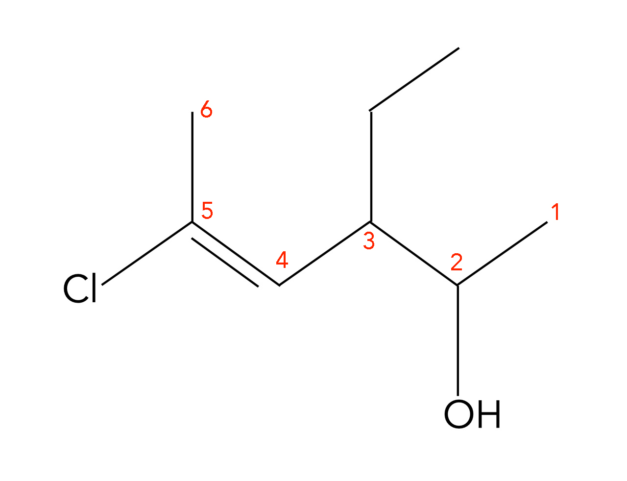 Am dritten C-Atom dieses Alkohols sitzt eine Ethyl-Gruppe, am fünften C-Atom das Chlor-Atom. Die C=C-Doppelbindung beginnt am vierten C-Atom. Der Name dieser Verbindung ist dann: 5-Chlor-3-ethyl-hex-5-en-2-ol. Besser aussprechen kann man die alternative Bezeichnung 5-Chlor-3-ethyl-4-hexen-2-ol [5].