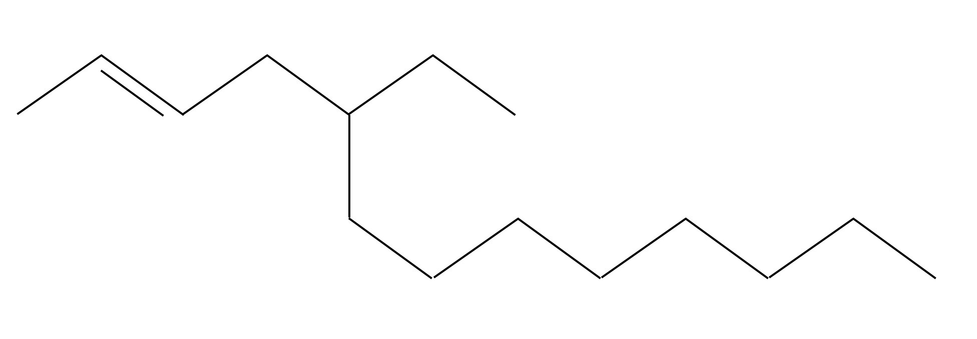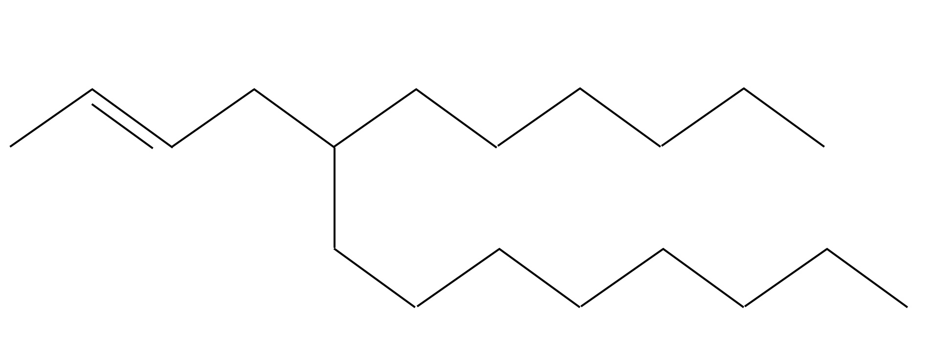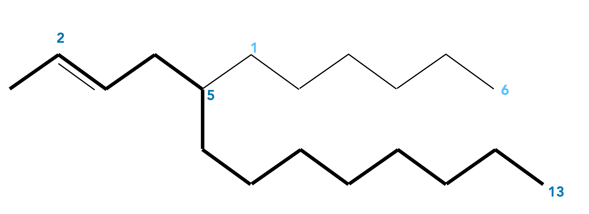 An der Position 5 dieser Hauptkette befindet sich eine Hexyl-Seitenkette, somit ist der Name dieses Alkens 5-Hexyl-tridec-2-en oder alternativ 5-Hexyl-2-Tridecen.