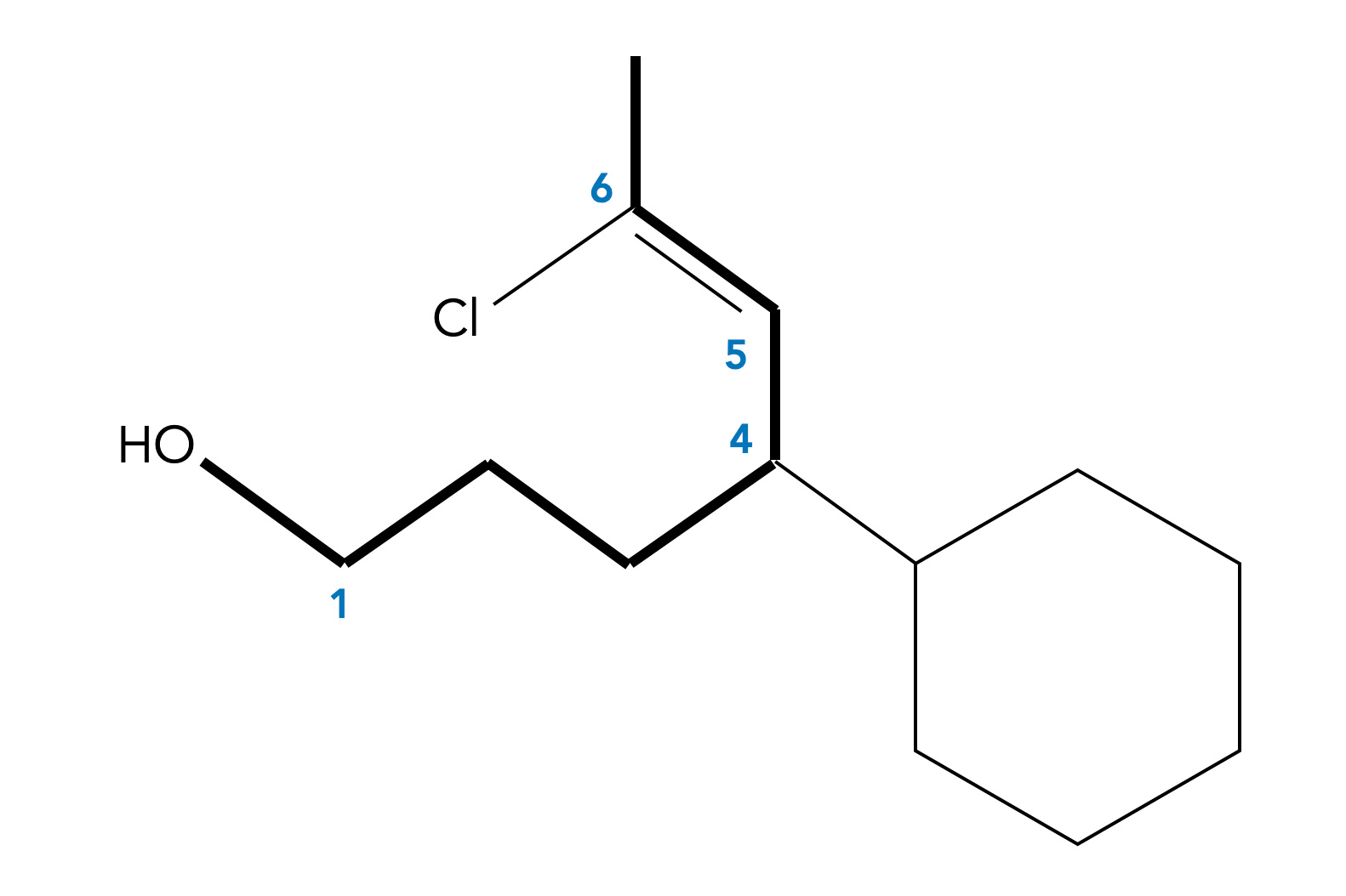 Das C-Atom mit der OH-Gruppe bekommt eine möglichst kleine Nummer, also 1. Dann sitzt am C-Atom 4 die Cyclohexyl-Gruppe und am C-Atom 6 das Chlor-Atom. Die Doppelbindung beginnt bei C-Atom 5. Der Name der Verbindung ist also 6-Chlor-4-cyclohexyl-5-hepten-1-ol.