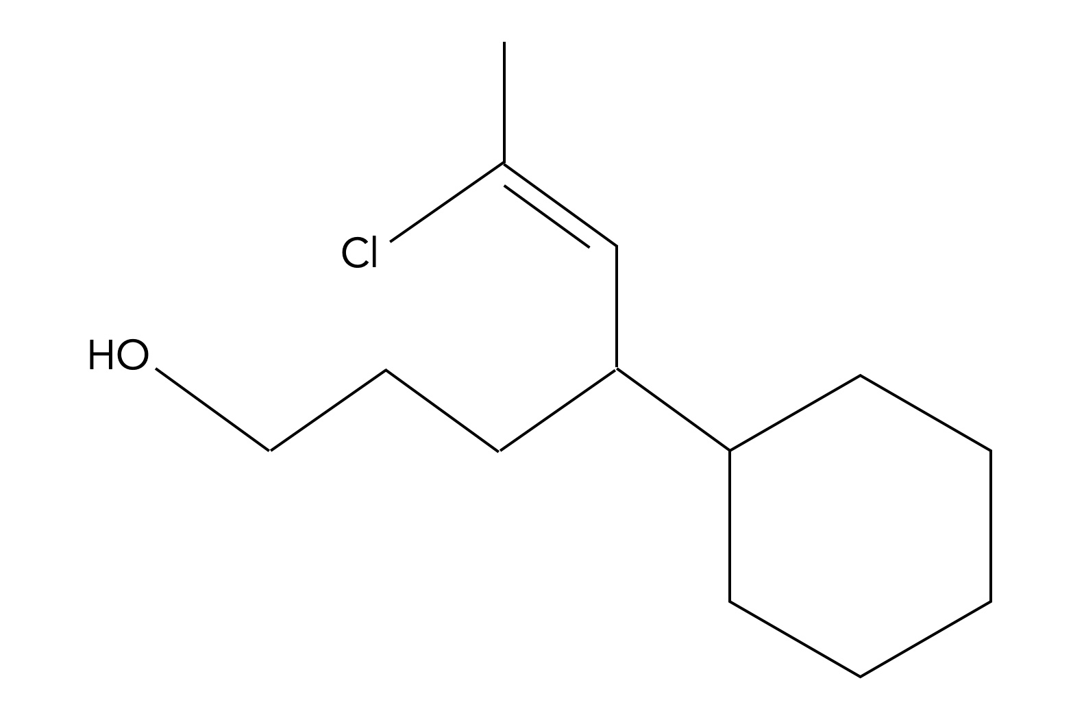 Ähnlich wie bei der Verbindung aus der Dyker-Vorlesung handelt es sich auch hier um einen Alkohol (die OH-Gruppe hat die höchste Priorität), außerdem ist ein Chlor-Atom, eine Doppelbindung und eine Cyclohexylgruppe vorhanden.