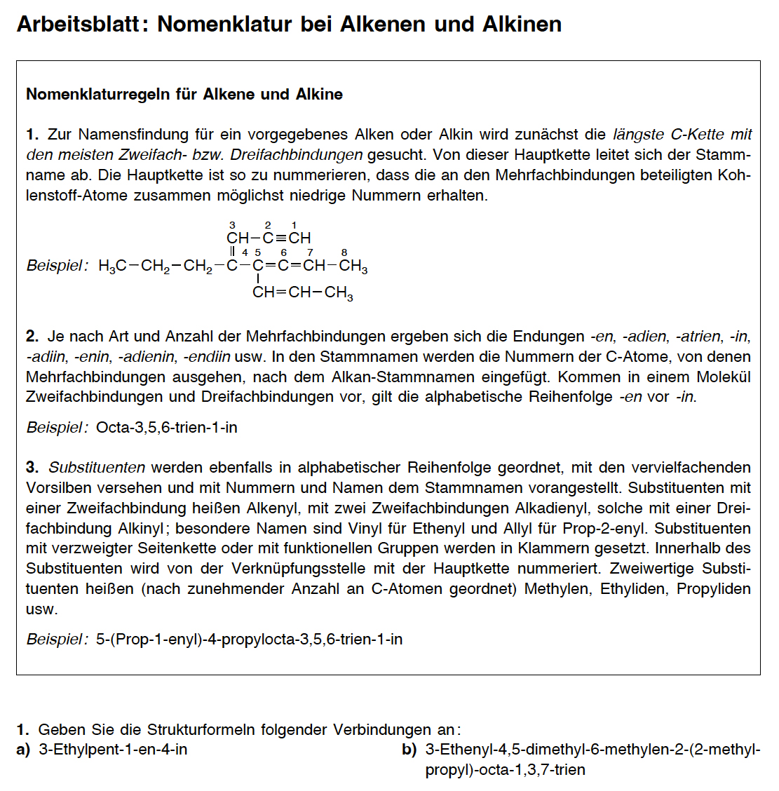 Es ist jetzt gar nicht so einfach, Inhalte zu finden, die über den normalen Oberstufen-Stoff hinausgehen. Wenn Sie die Seite zur Nomenklatur der Alkane gelesen und verstanden haben, dann sollten Sie auch in der Lage sein, Alkene mit verzweigten Seitenketten richtig zu benennen.