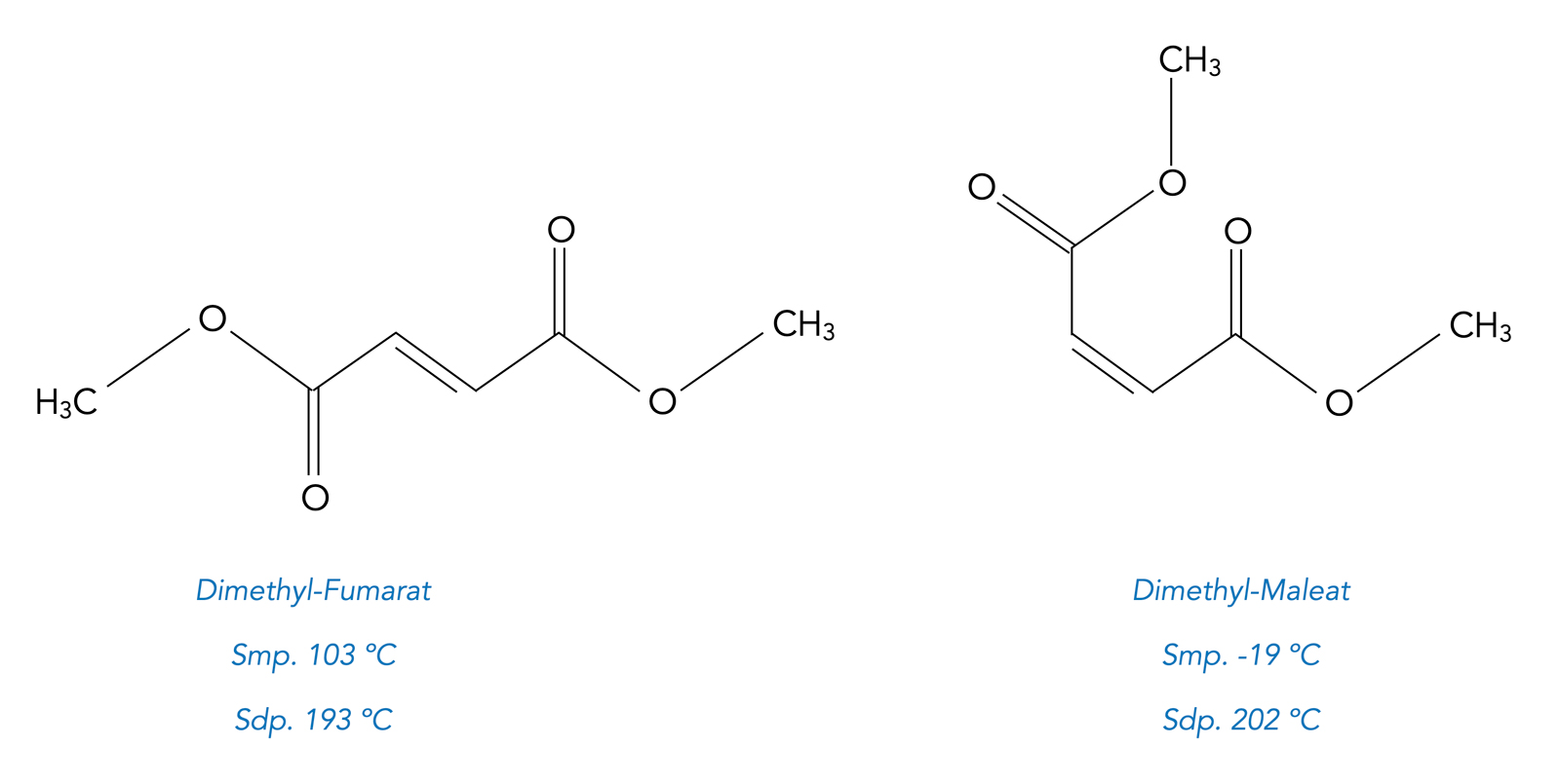 Sie sehen hier die Strukturformeln, Schmelzpunkte und Siedepunkte von zwei isomeren Estern: Dimethyl-Fumarat ist ein Methanol-Ester der Fumarsäure, Dimethyl-Maleat ein Methanol-Ester der Maleinsäure [3].