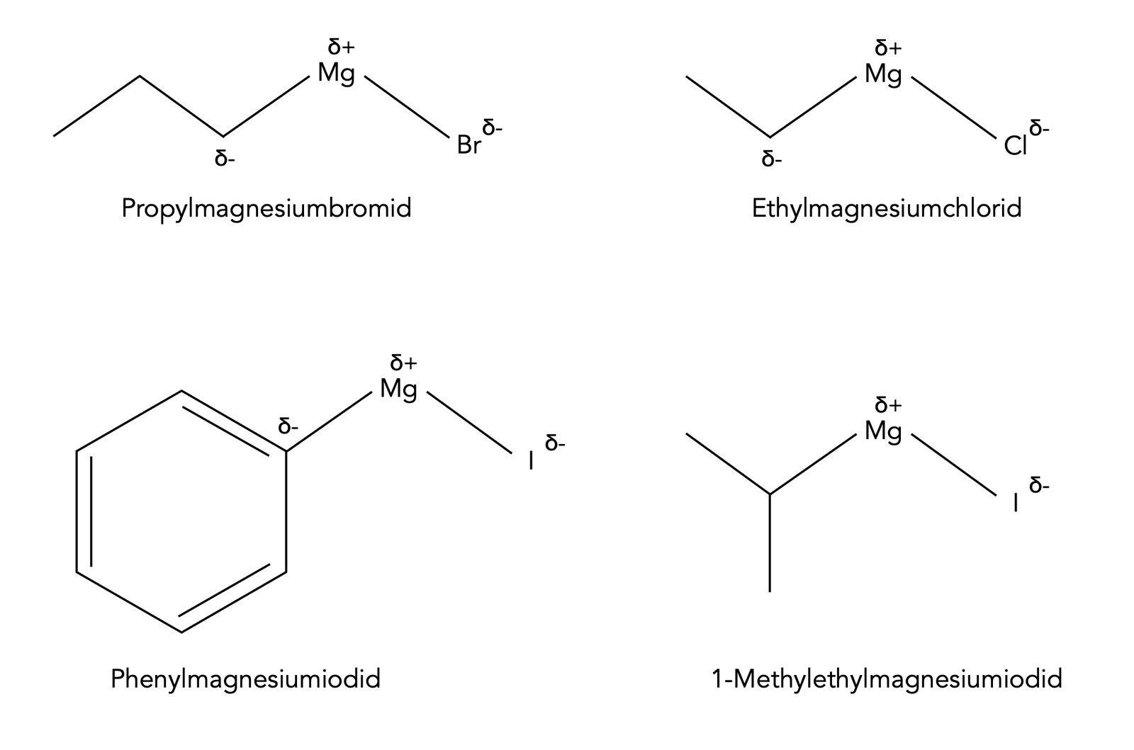 Die Nomenklatur der Grignard-Verbindungen sollte aus der Abbildung hervorgehen: Erst der Alkylrest, dann das Wort "magnesium", dann das Halogen, also beispielsweise Propylmagnesiumbromid oder Ethylmagnesiumchlorid.