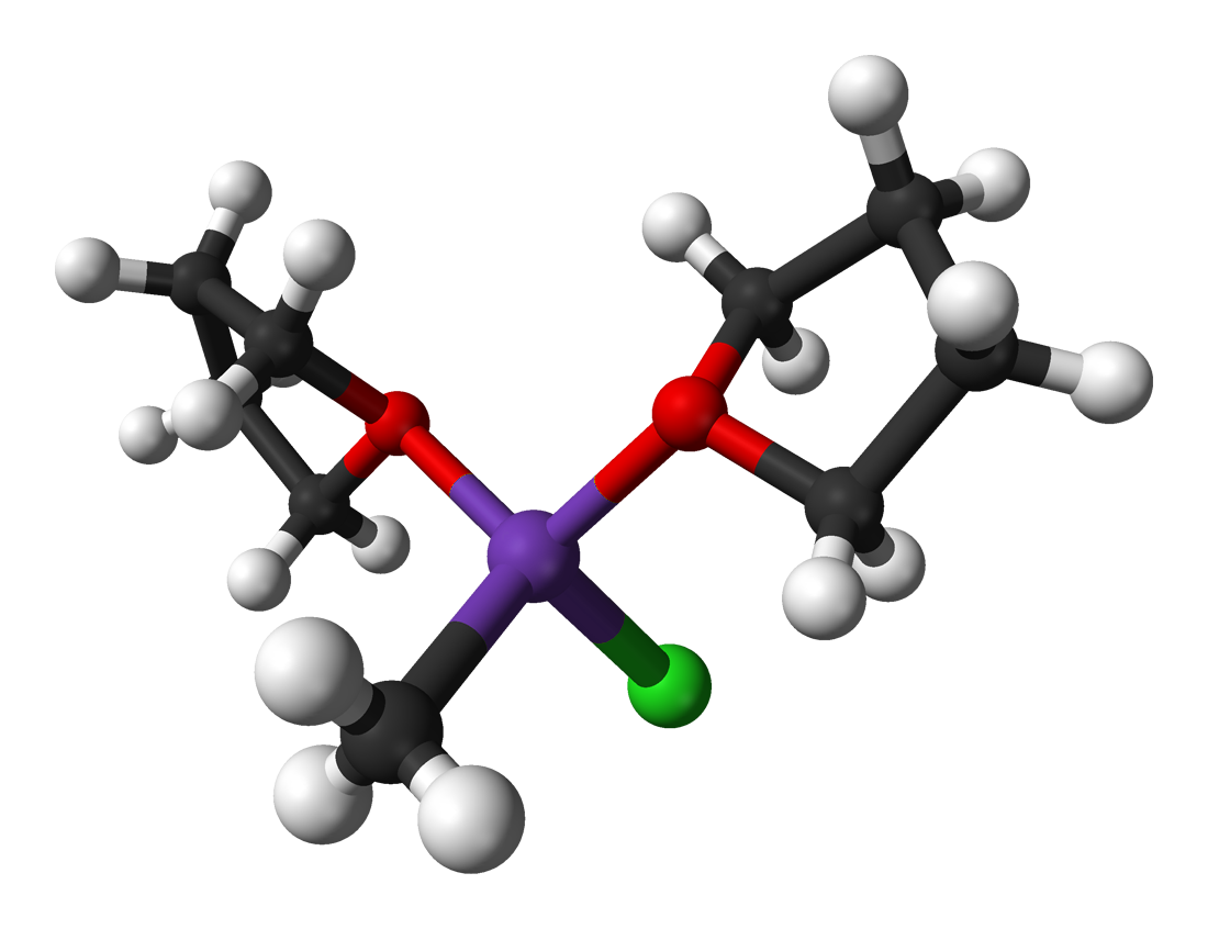 Das Mg-Atom (violett) besitzt eine kovalente Bindung zu dem Alkylrest (unten links, ein Methylrest) und eine kovalente Bindung zu dem Halogen-Atom (unten rechts, grün). Darüber hinaus werden aber auch zwei kovalente Bindungen zu den O-Atomen (rot) des Ethers ausgebildet.