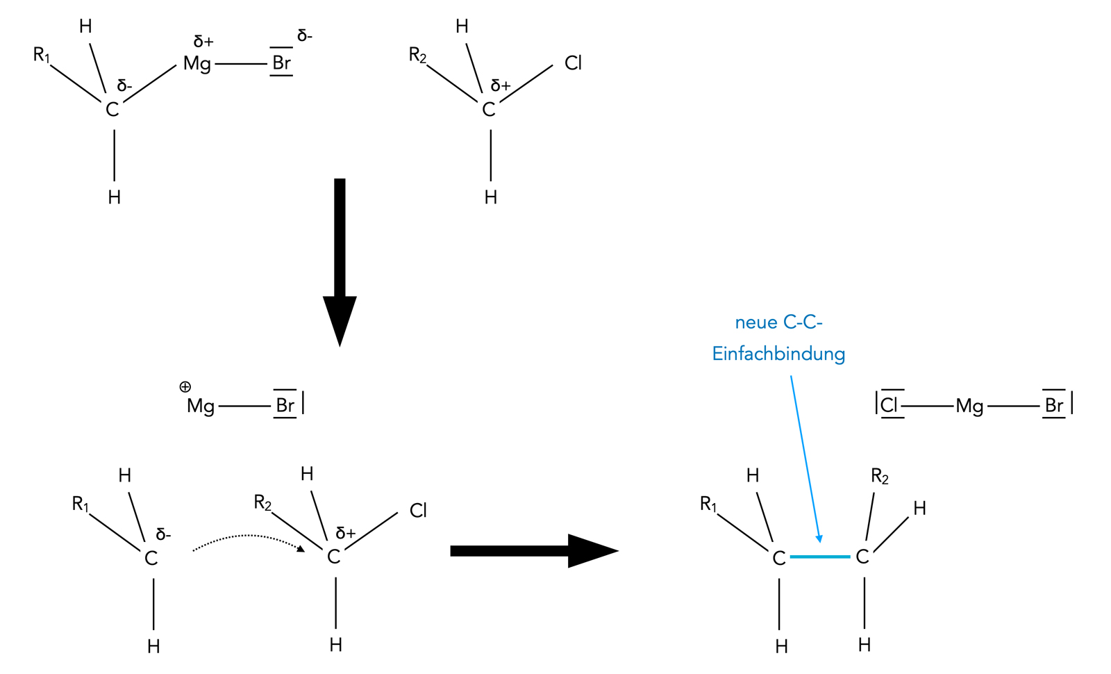 Wenn man sich eine Grignard-Verbindung näher anschaut, sieht man leicht, dass sie von der Wirkung her einem Carbanion entspricht. Das C-Atom des Alkylrestes ist derart stark negativ polarisiert, dass es die Eigenschaften eines Carbanions hat und nucleophile Reaktionen eingehen kann.