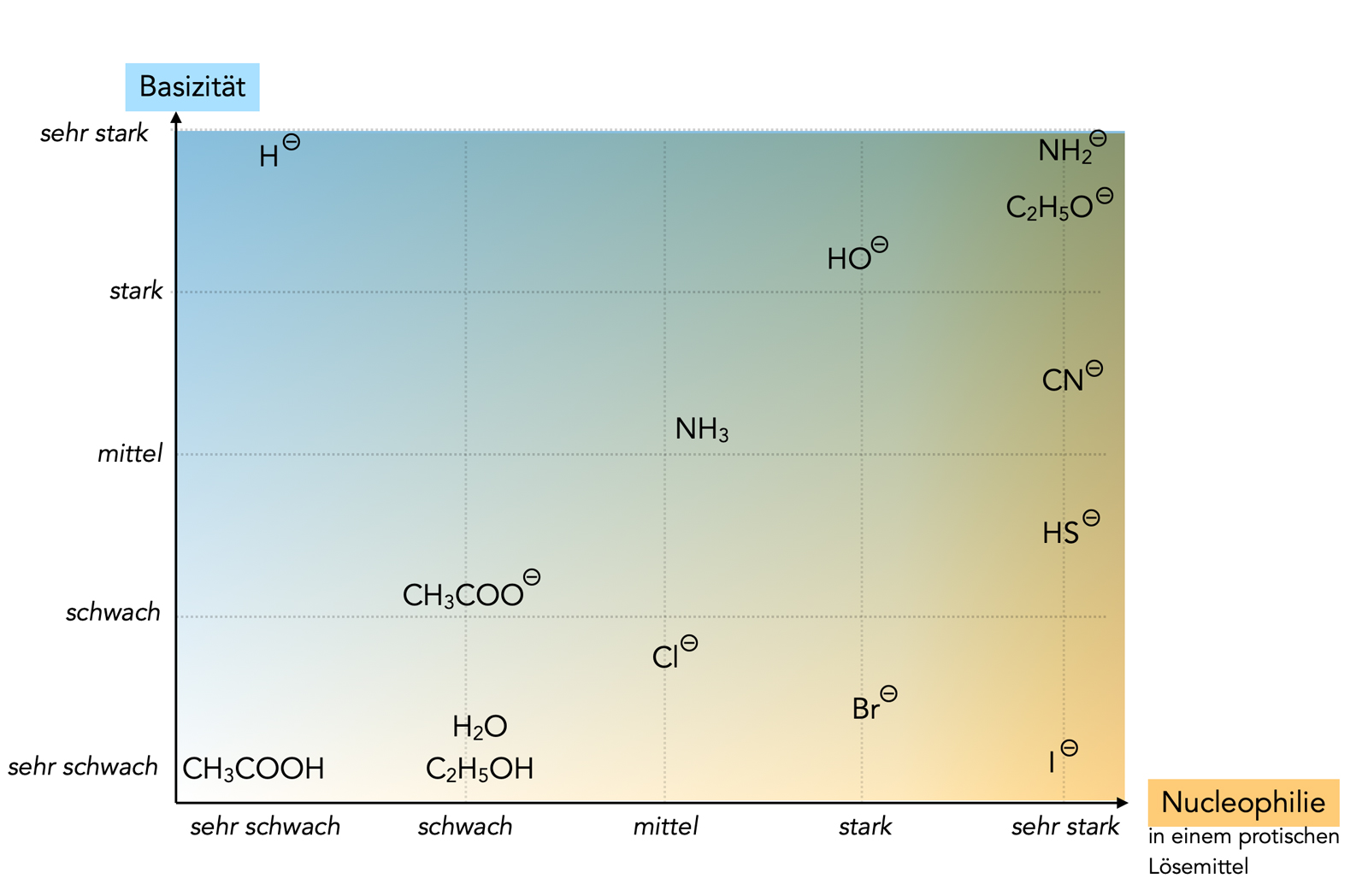 Das obige Schema habe ich aus mehreren Quellen konstruiert. Die pKS-Werte der Basen finden sich auf der Wikipedia-Seite "Säurekonstante". Die Angaben zur Nucleophilie in einem protischen Lösemittel habe ich mir aus verschiedenen Quellen zusammengesucht.
