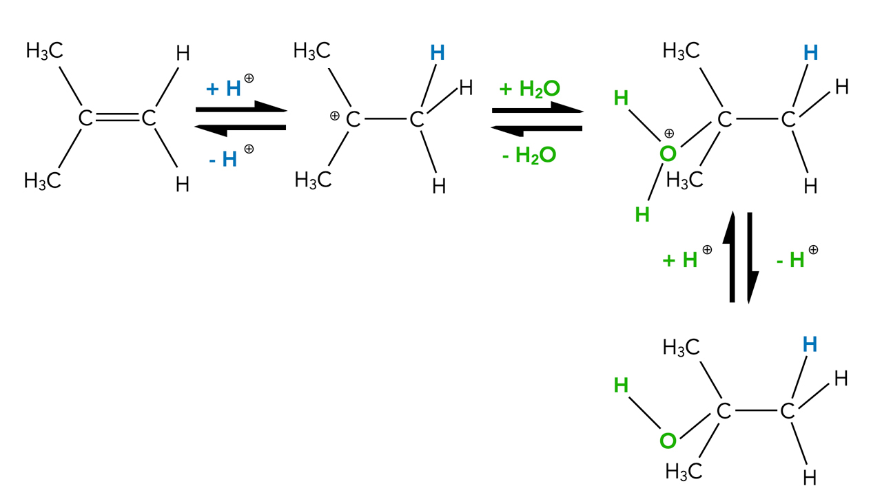 - Elektrophile Addition: Alkenen können durch Addition von Wasser zu Alkoholen umgewandelt werden. Die Reaktion ist säurekatalysiert.
