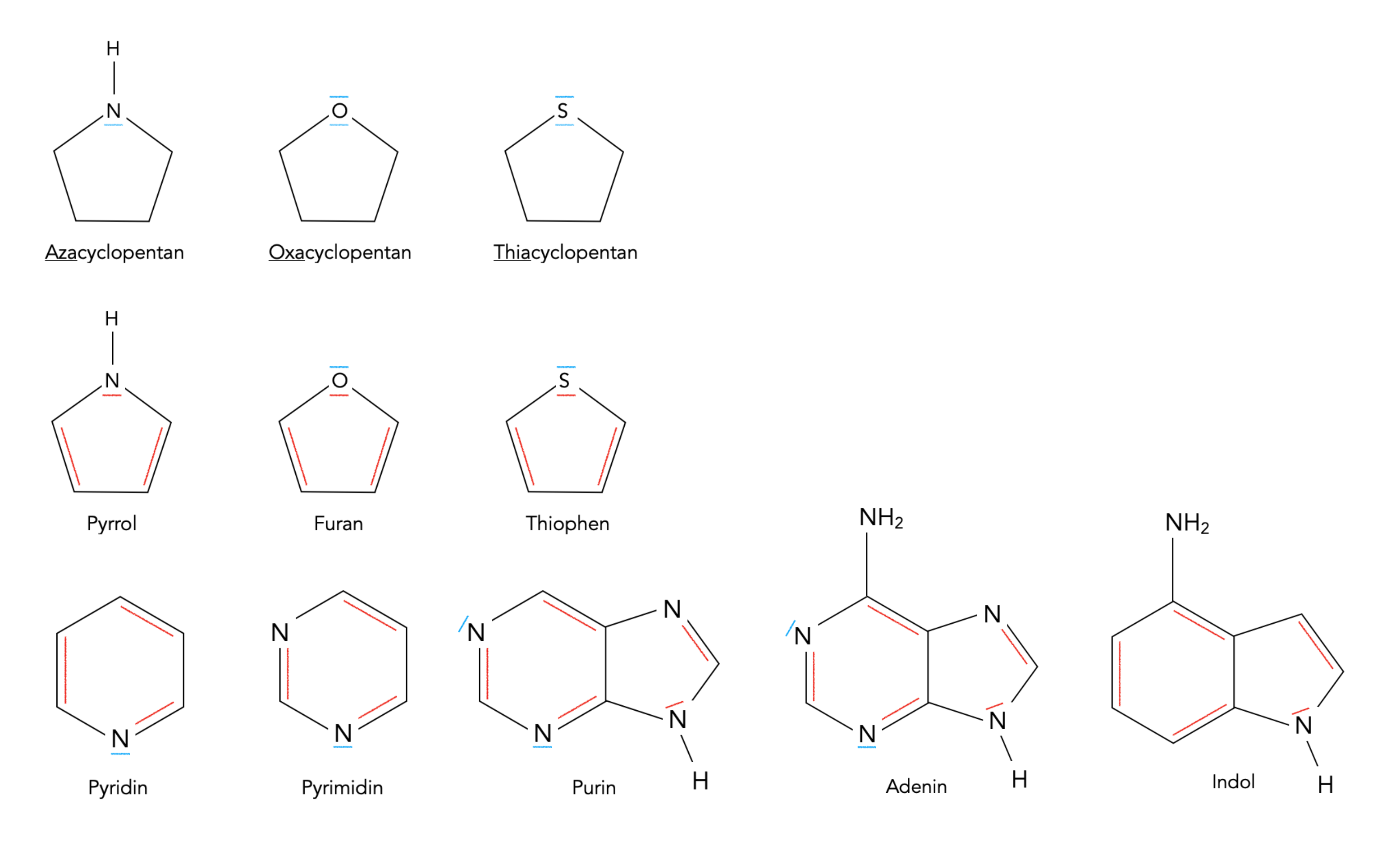 Die beiden folgenden Reihen zeigen aromatische Heterocyclen, einmal die fünfgliedrigen Heterocyclen Pyrrol, Furan und Thiophen, dann die sechsgliedrigen Heterocyclen Pyridin und Pyrimidin, und schließlich etwas komplexere, aus zwei Ringen bestehende Heterocyclen, u.a. die DNA-Base Adenin.