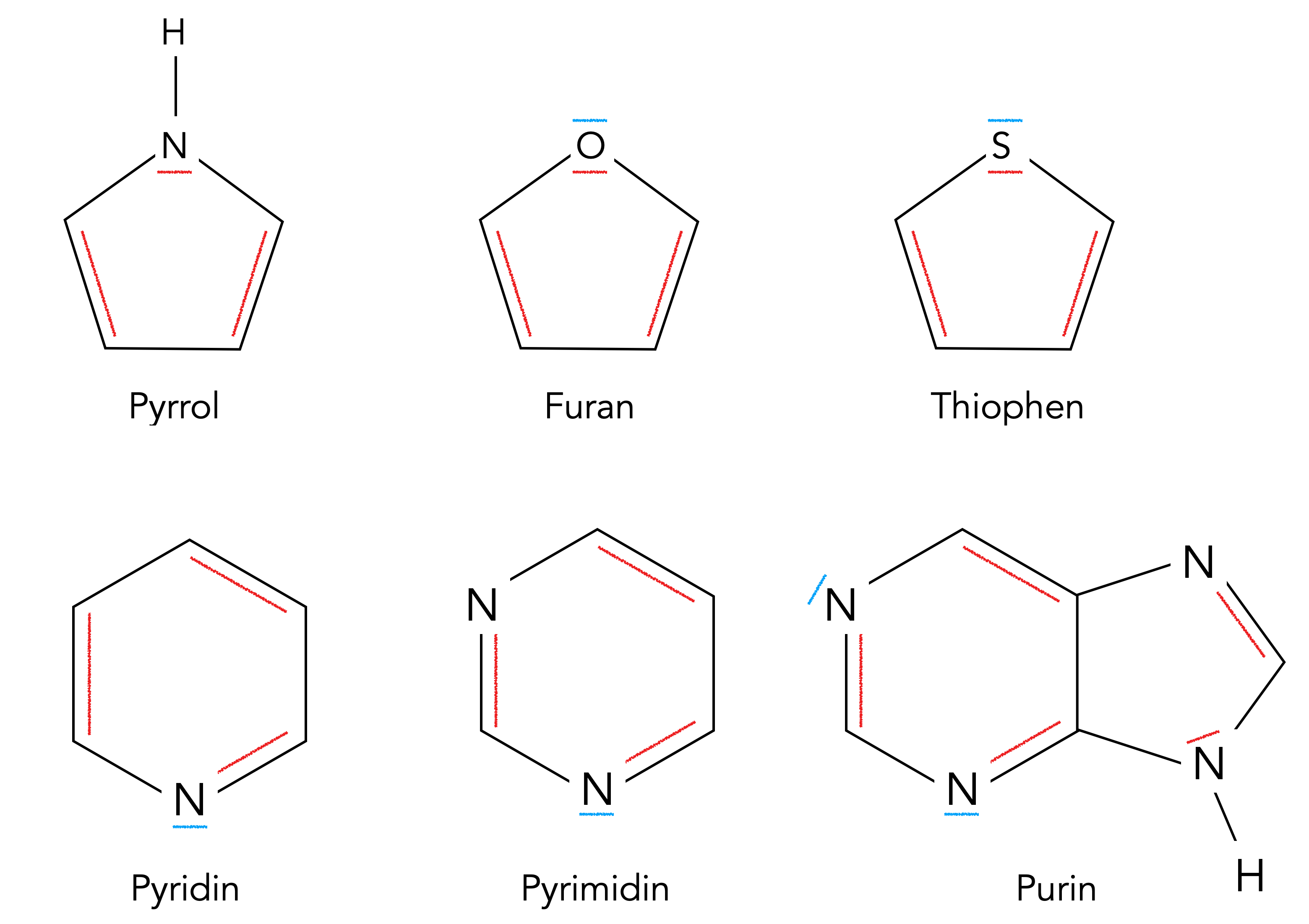 Zu den hier gezeigten aromatischen Heterocyclen gibt es jeweils einen eigenen Artikel im Chemie-Lexikon auf dieser Homepage.