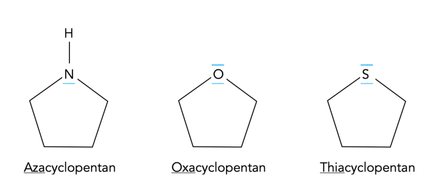 Die Benennung von Cycloalkanen mit einem Heteroatom ist recht einfach. Man nimmt den Namen des Cycloalkans und setzt die Silbe "Aza", "Oxa" oder "Thia" vor den namen, je nachdem ob ein Stickstoff-, ein Sauerstoff- oder ein Schwefel-Atom das Hetero-Atom ist. Sollte mal ein Phosphor-Atom als Hetero-Atom vorkommen, würde man das Präfix "Phospha" benutzen.
