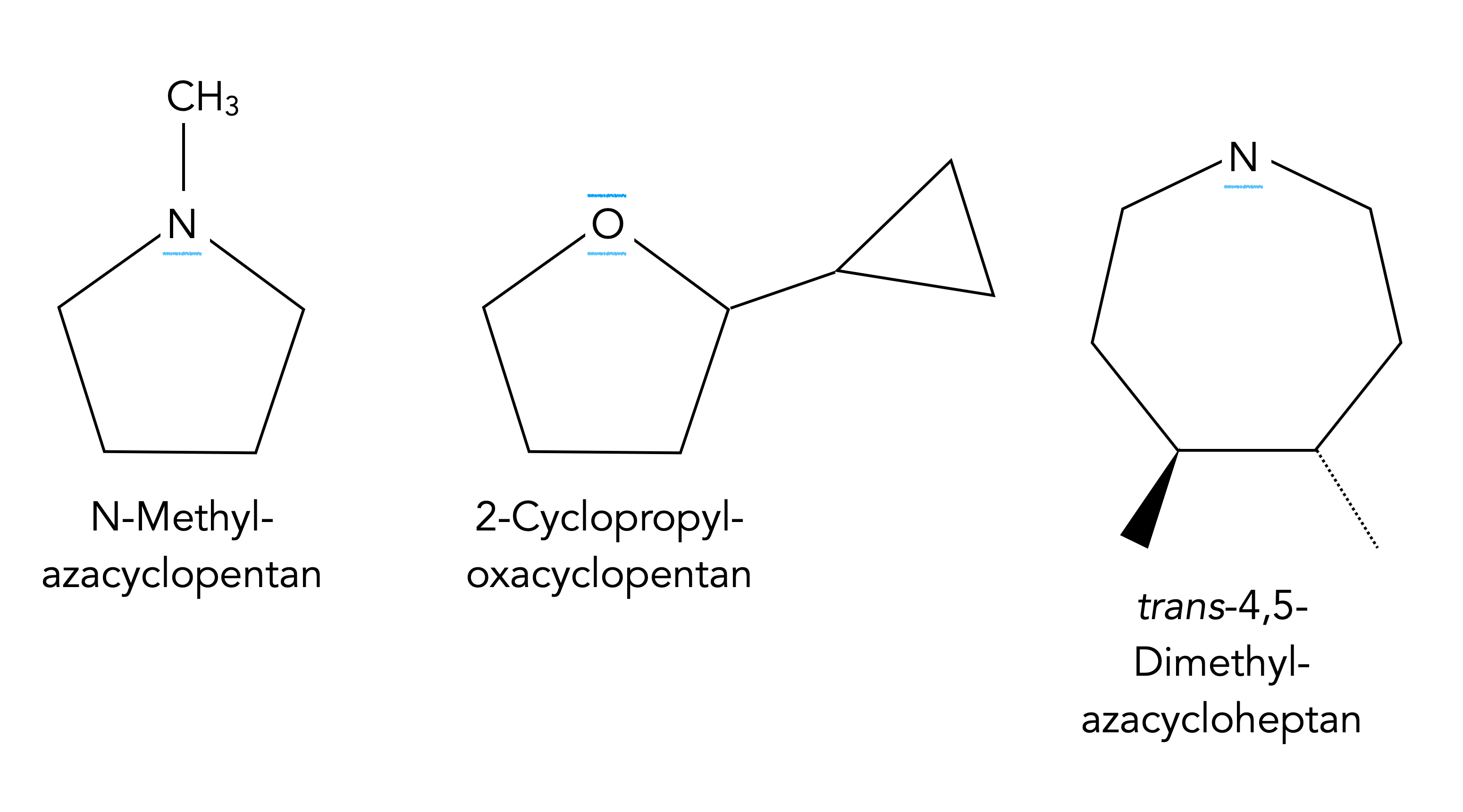 Interessant wird es, wenn der Substituent am Heteroatom sitzt. Dann wird keine Positionsnummer angegeben, sondern das Symbol des Hetero-Atoms wird vor den Substituenten gesetzt: N-Methylazacyclopentan. Ist der Substituent ein Cycloalkan, wird dessen Name benutzt, ähnlich wie wir es bei der Nomenklatur der Cycloalkane gesehen haben.