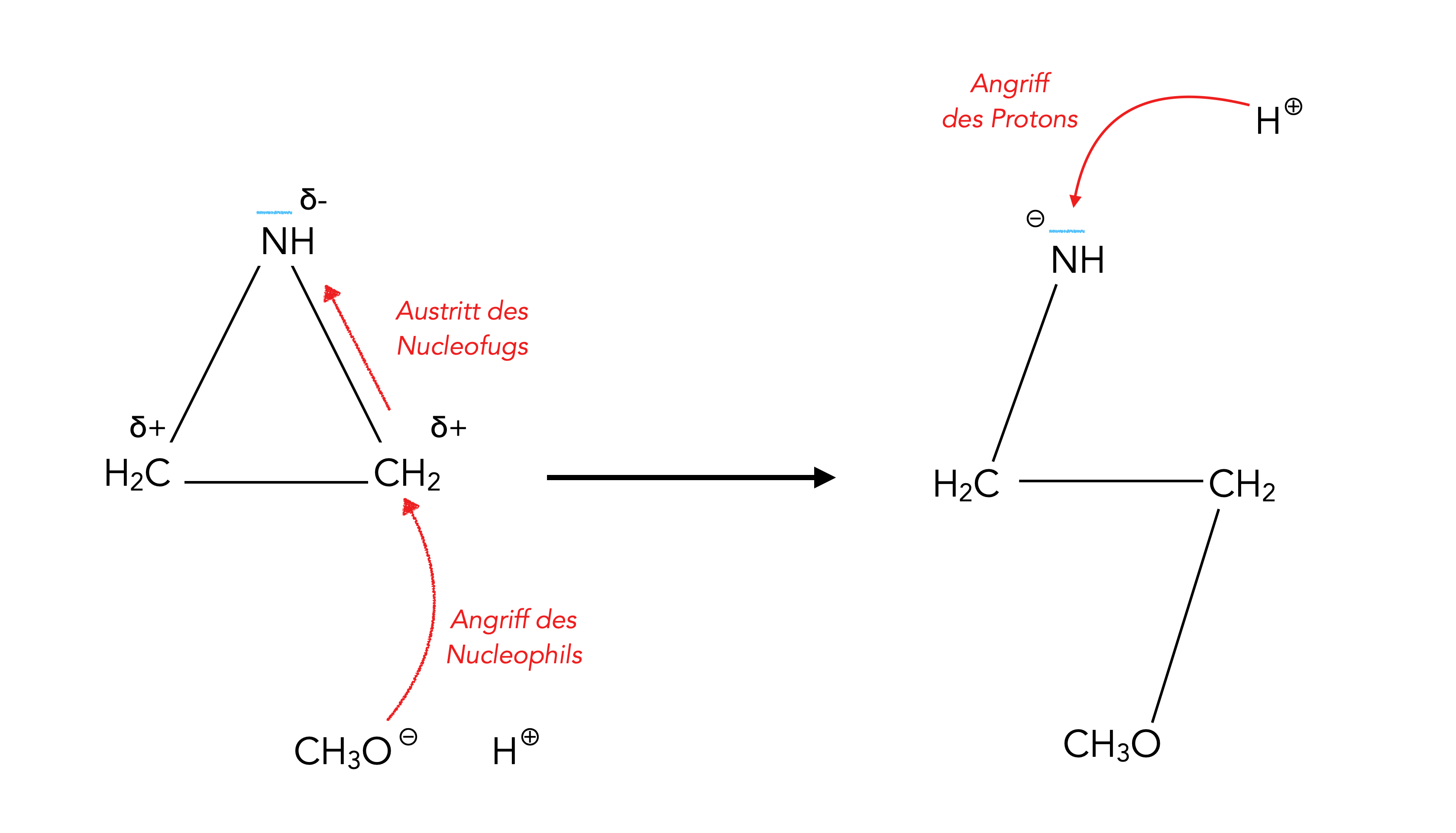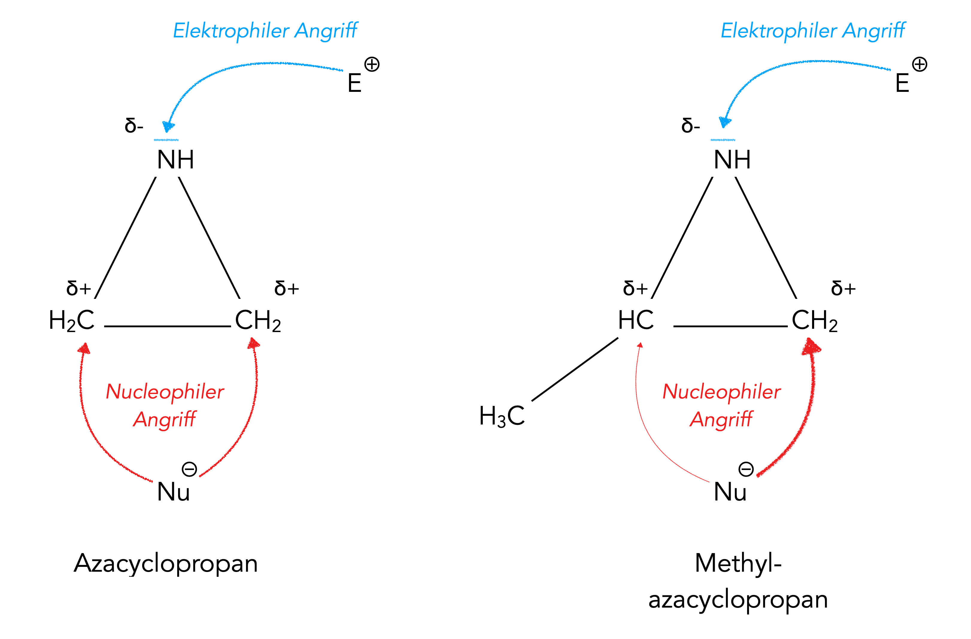 Wegen der hohen Elektronegativität des N-Atoms sind die beiden C-Atome positiv polarisiert und können nucleophil angegriffen werden. Beim Azacyclopropan sind die beiden C-Atome gleichwertig, die Wahrscheinlichkeit eines nucleophilen Angriffs ist hier also völlig identisch. Beim Methylazacyclopropan wird dagegen das weniger substituierte C-Atom mit höherer Wahrscheinlichkeit angegriffen. Das substituierte C-Atom hat wegen des +I-Effekts der Methylgruppe eine höhere Elektronendichte als das nicht-substituierte C-Atom, hier die die Elektronendichte geringer, was einen nucleophilen Angriff wahrscheinlicher macht.