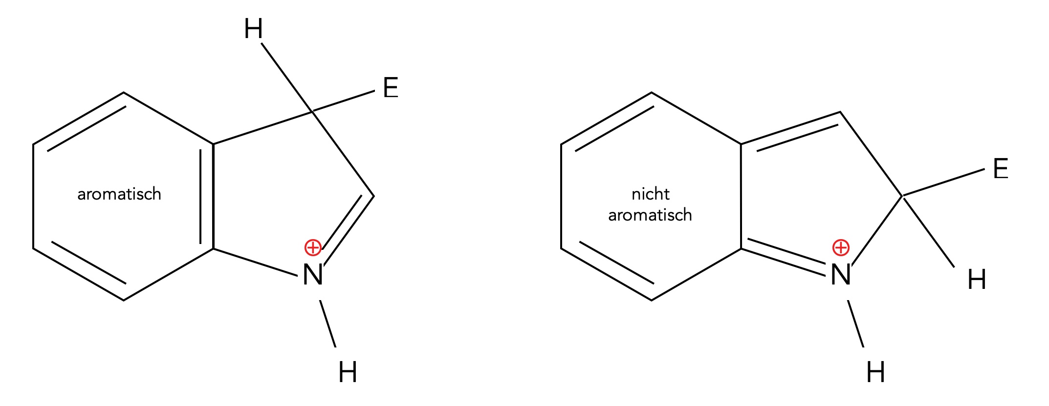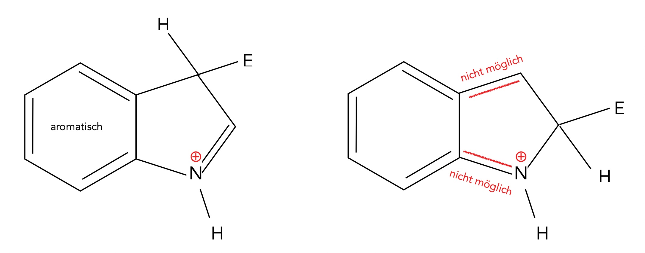 Im Grund reagiert Indol wie ein Pyrrol, elektrophile Substitutionen finden nämlich nicht am Benzolring statt, sondern am reaktiveren Pyrrolring des Indols. Einen wichtigen Unterschied zum Pyrrol gibt es hier allerdings: Während die SE beim Pyrrol hauptsächlich an der Position 2 stattfindet, ist beim Indol wie Wahrscheinlichkeit einer SE an Position 3 größer.