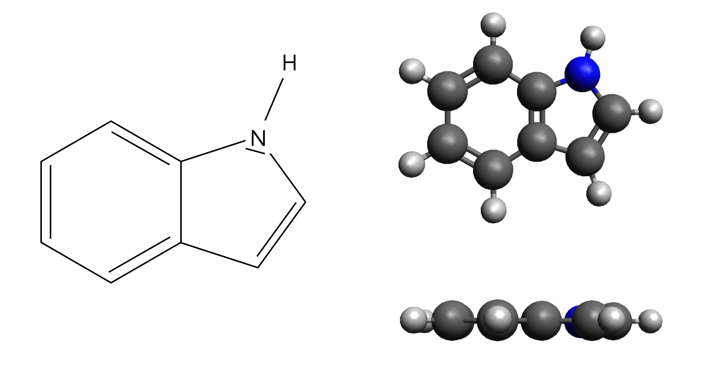 Die Seitenansicht des Molekülmodells zeigt, dass das gesamte Doppelring-System planar ist. Außerdem ist die (4n+2)-Regel von Hückel erfüllt, da sich zehn π-Elektronen in den beiden Ringen befinden. Das freie Elektronenpaar des N-Atoms gehört mit zu diesen π-Elektronen - genau wie beim Pyrrol.