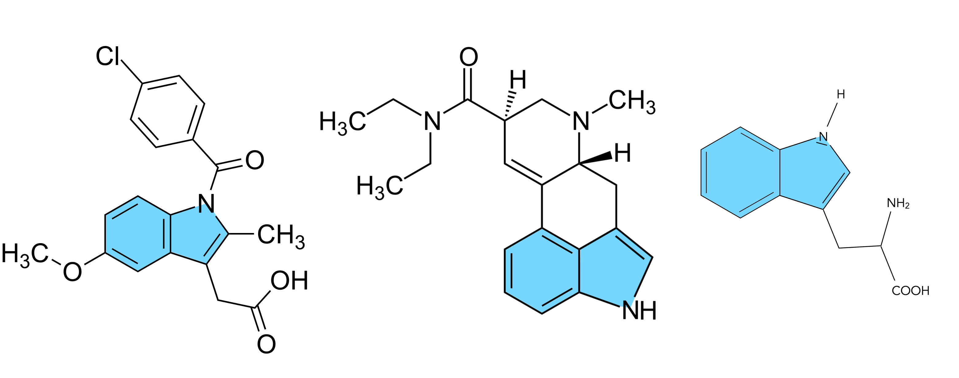 Indometacin, ein Wirkstoff gegen Arthritis, enthält eine Indol-Gruppe, genau wie Lysergsäurediethylamid, eher als LSD bekannt: