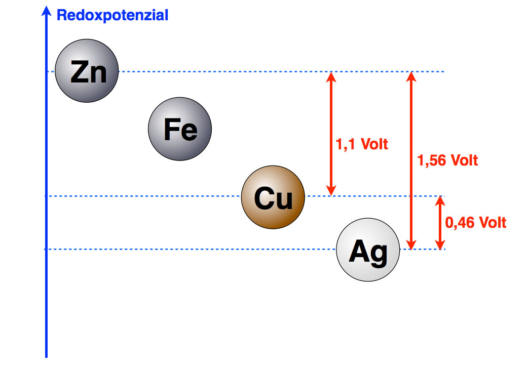 Die absoluten Werte von Zink und Kupfer sind nicht bekannt, können im Prinzip auch nicht ermittelt werden. Was ermittelt werden kann, ist aber die Redoxpotenzial-Differenz, also der Unterschied zwischen den Werten der verschiedenen Metalle. Bei einem Kupfer-Zink-Element misst man unter Standardbedingungen eine Potenzialdifferenz von 1,1 Volt.