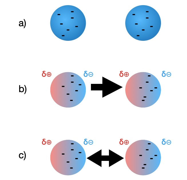 c) Wir haben jetzt zwei temporäre Dipole (der linke spontan entstanden, der rechte vom linken induziert), die sich gegenseitig anziehen. Diese schwache Anziehungskraft bezeichnet man als London-Kraft. London-Kräfte gehören zu den van-der-Waals-Kräften.