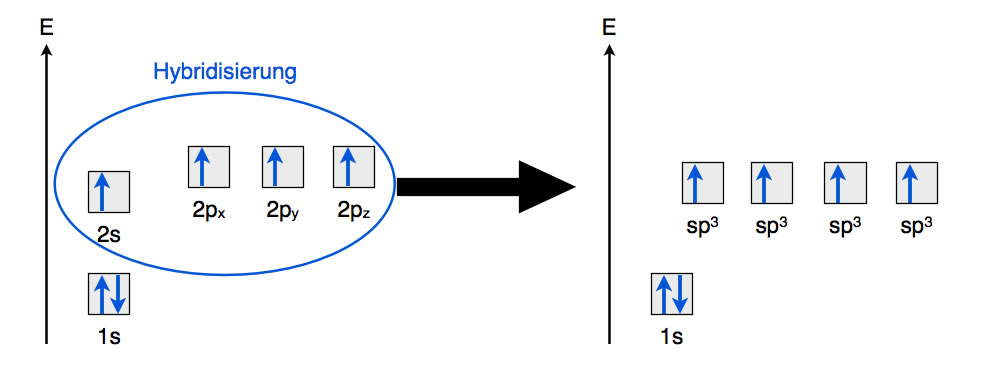 Bei der Hybridisierung wird das einfach besetzte 2s-Orbital mit den drei einfach besetzten 2p-Orbitalen "vermischt", dabei entstehen vier energetisch gleichwertige sp3-Hybridorbitale. Diese vier Hybridorbitale stoßen sich nun aufgrund ihrer negativ geladenen Elektronen gegenseitig ab, und der Zustand minimaler Energie ist die tetraedrische Anordnung der vier Hybridorbitale, wie wir es bereits vom Kugelwolkenmodell her kennen. Diese Hybridisierung erfordert übrigens keine Hybridisierungsenergie, da sich die Gesamtenergie des C-Atoms durch die Hybridisierung nicht ändert. In der Zeichnung kann man gut sehen, dass das Energieniveau der vier Hybridorbitale etwas niedriger liegt als das der p-Orbitale, aber höher als das des 2s-Orbitals.