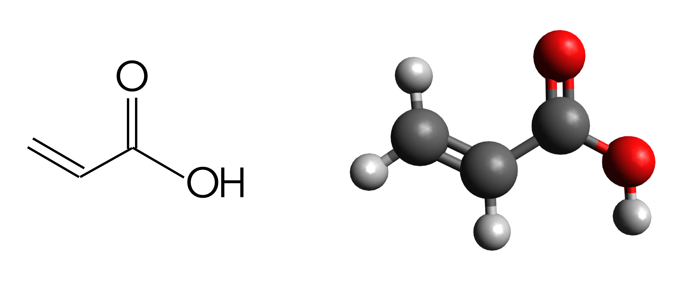 Die Acrylsäure oder Propensäure ist eine ungesättigte Carbonsäure, die von der Propansäure abgeleitet ist. Sie kommt in der Natur nicht vor, und wird für die industrielle Verwendung durch katalytische Oxidation von Propen hergestellt. Zunächst entsteht Propenal (Acrolein), dieser ungesättigte Aldehyd wird dann zur Acrylsäure oxidiert.
