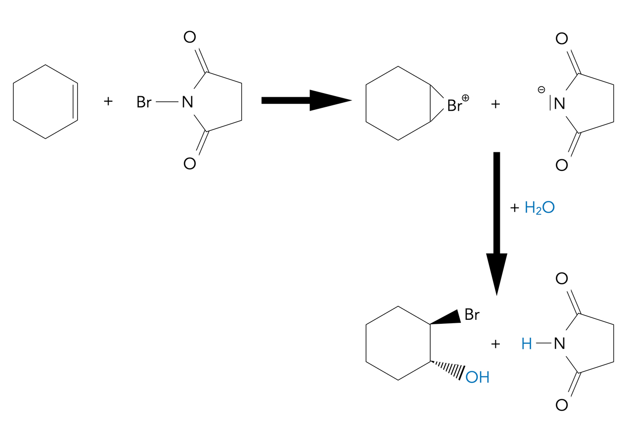 Das Bromsuccinimid kann leicht ein Brom-Kation abspalten. Dieses bildet dann mit dem Alken ein Bromonium-Ion. Wasser greift das Bromonium-Ion dann SN2-artig von der Rückseite her an. Das Ergebnis dieser anti-Addition ist ein trans-Produkt.