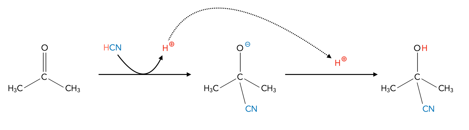 Eine wichtige Synthese ist die nucleophile Addition von Cyanwasserstoff (Blausäure, HCN) an Aceton. Das Reaktionsprodukt Acetoncyanhydrin ist ein wichtiges Zwischenprodukt bei der Herstellung von Methacrylsäuremethylester, dem Monomer des Kunststoffes Plexiglas.