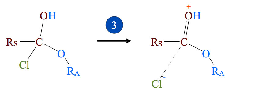 Das Chlor-Atom wird nun als Chlorid-Ion abgespalten; es bleibt ein positiv geladenes organisches Ion zurück. Die positive Ladung "wandert" vom C-Atom zur OH-Gruppe, was nicht gerade sehr stabil aussieht.