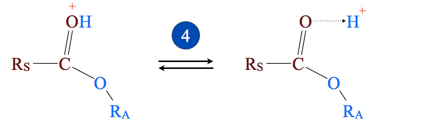 Dieser Schritt verläuft ähnlich wie bei der säurekatalysierten Veresterung einer Carbonsäure. Das Proton "wandert" vom Alkohol-O-Atom zur Hydroxygruppe der Carbonsäure. Allerdings bildet sich eine stabile OH-Gruppe. Bei der säurekatalysierten Veresterung bildete sich in Schritt 3 ja ein Oxonium-Ion, dass im nächsten Schritt dann leicht als Wasser-Molekül abgespalten werden konnte.