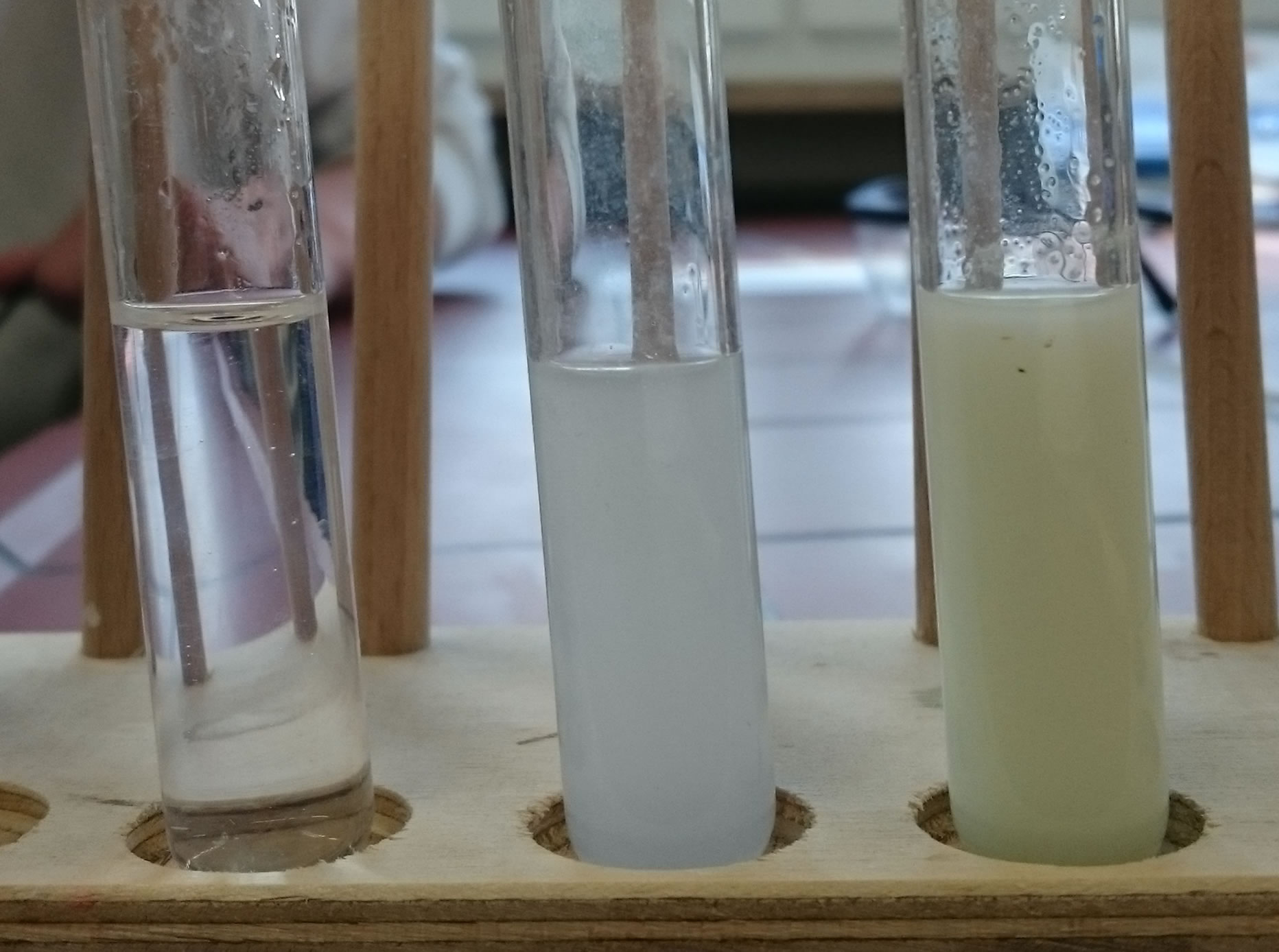 Dieses Photo zeigt das Ergebnis eines einfachen Versuchs. Drei verschiedene Brom-Butane wurden mit Ethanol und Silbernitratlösung zusammengegeben. Dann wurde jedes Reagenzglas leicht geschüttelt.