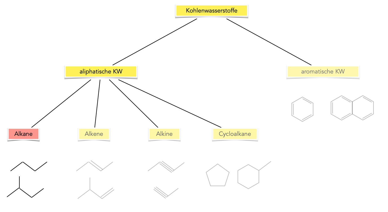 Alkane gehören zu den Kohlenwasserstoffen, das sind organische Verbindungen, die nur aus Kohlenstoff- und Wasserstoff-Atomen bestehen. Hier eine kurze Übersicht über die Kohlenwasserstoffe: