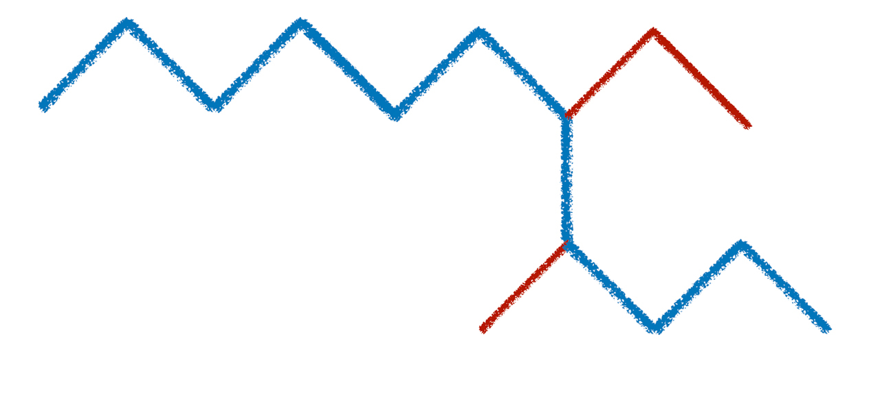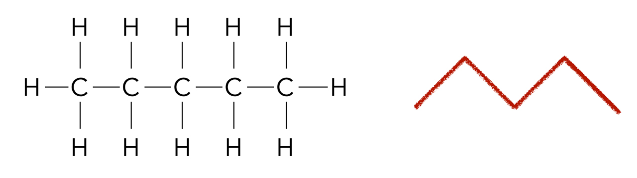 In der Organischen Chemie ist es üblich, längere Moleküle mit Hilfe von Skelett-Formeln darzustellen. Man zeichnet dabei keine Kohlenstoff- oder Wasserstoff-Atome mehr, sondern macht einfache Zick-Zack-Kurven. Dabei steht jedes "Zick" und jedes "Zack" für ein C-Atom mit den daran hängenden H-Atomen. Damit Sie das Ganze besser verstehen, falls diese Darstellungsweise neu für Sie ist, hier noch einmal das Pentan-Molekül in der üblichen Schreibweise und daneben die Skelett-Formel: