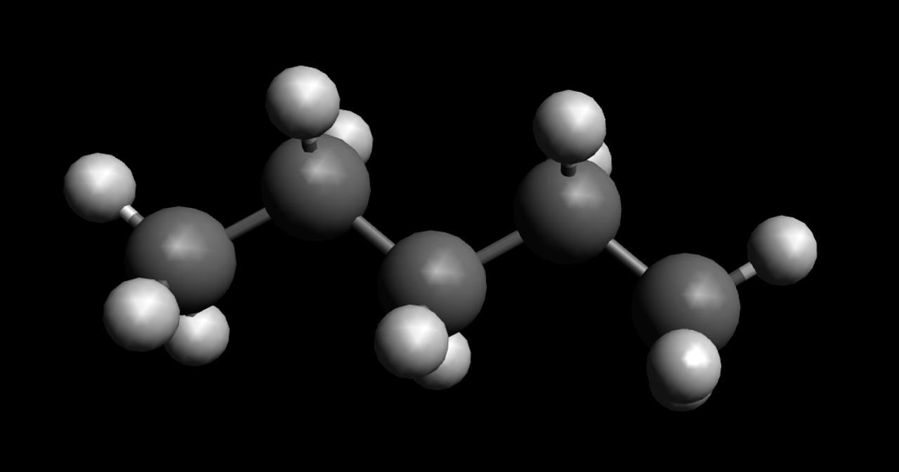 Sie sehen, wie viel einfacher sich eine Skelett-Formel zeichnen lässt. Außerdem gibt die Skelett-Formel die Bindungswinkel innerhalb des Moleküls besser wieder als die einfache Strukturformel. Dazu schauen wir uns mal ein Molekülmodell des Pentans an: