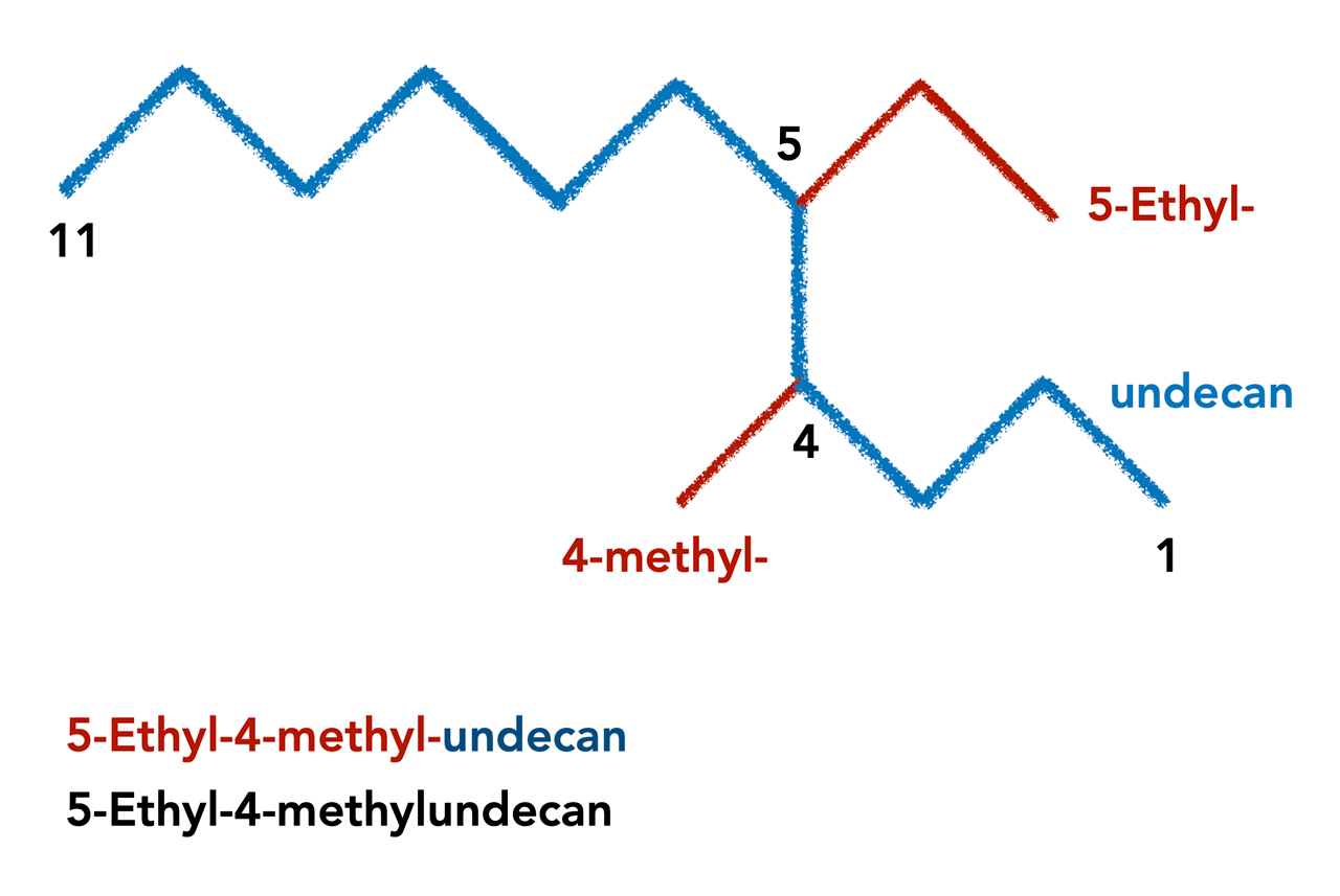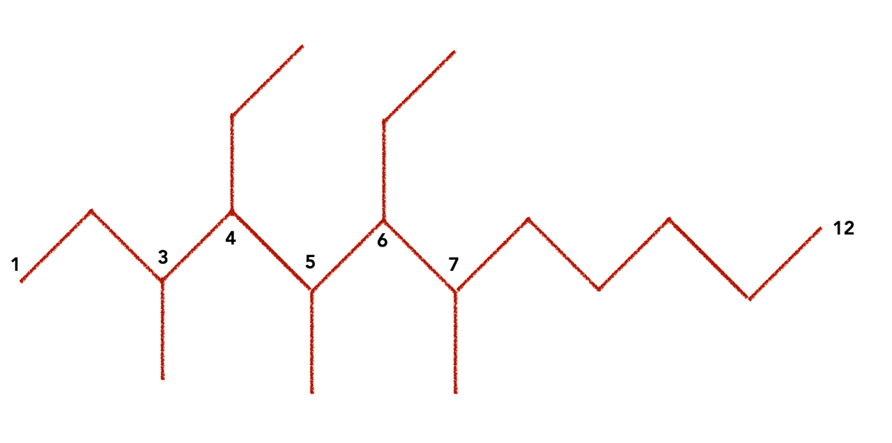 Wenn wir bei unserem Dodecan von rechts anfangen zu nummerieren, erhält die Methyl-Gruppe die Ziffer 4 und die Ethyl-Gruppe die Ziffer 5. Wären wir dagegen von links angefangen, säße die Ethyl-Gruppe an Position 7 und die Methyl-Gruppe an Position 8.