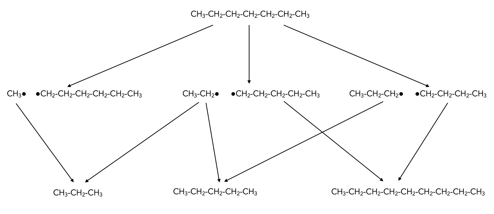 Beim thermischen Cracken laufen übrigens ähnliche Prozesse ab: Lange Alkane werden durch hohe Temperaturen in kurze Alkylradikale gespalten, die dann auf die oben gezeigte Weise zu kürzeren Alkanen oder Alkenen reagieren. Natürlich entstehen dabei durch Rekombination von Radikalen auch wieder Moleküle längerer Alkane, aber diese können dann wieder durch die hohe Temperatur in zwei neue Alkylradikale gespalten werden.