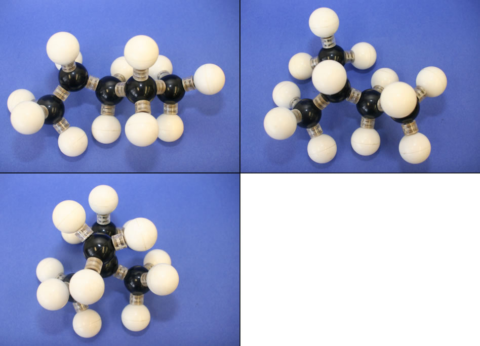 "Vier C-Atome sind durch drei Einfachbindungen zu einer Kette verbunden. Die beiden mittleren C-Atome sind außerdem mit je zwei H-Atomen verknüpft, während die beiden äußeren C-Atome mit je drei H-Atomen verbunden sind."