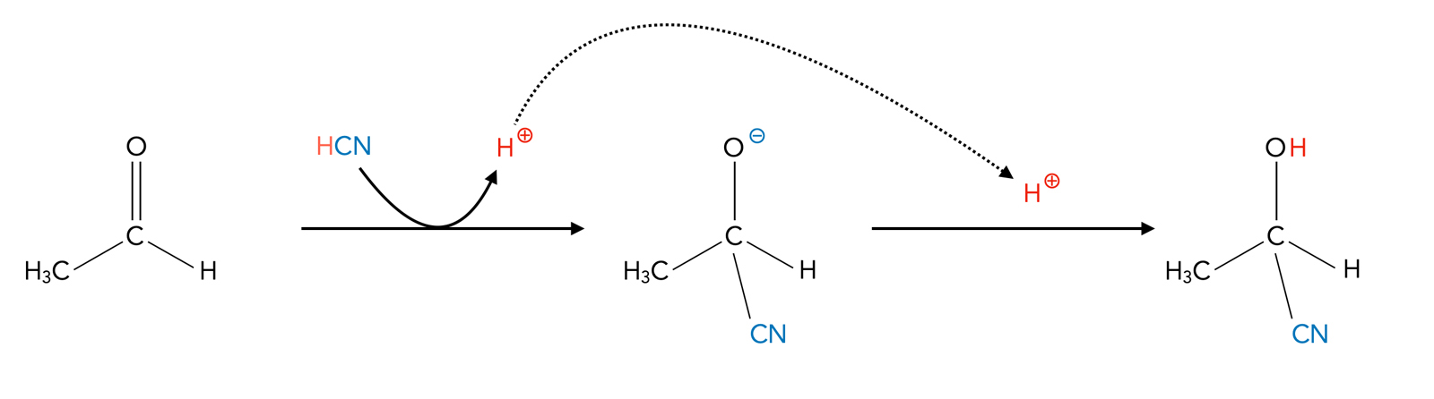 Im ersten und langsamen Schritt setzt sich das Cyanid-Ion -CN (mit der negativen Ladung am C-Atom!) an das positiv polarisierte C-Atom des Aldehyds, und die negative Ladung, die das Cyanid-Ion mitbringt, wird auf das elektronegative O-Atom übertragen. Im zweiten und schnellen Schritt setzt sich ein Proton der Blausäure HCN an dieses nunmehr negativ geladene O-Atom, und fertig ist das sogenannte Cyanhydrin.