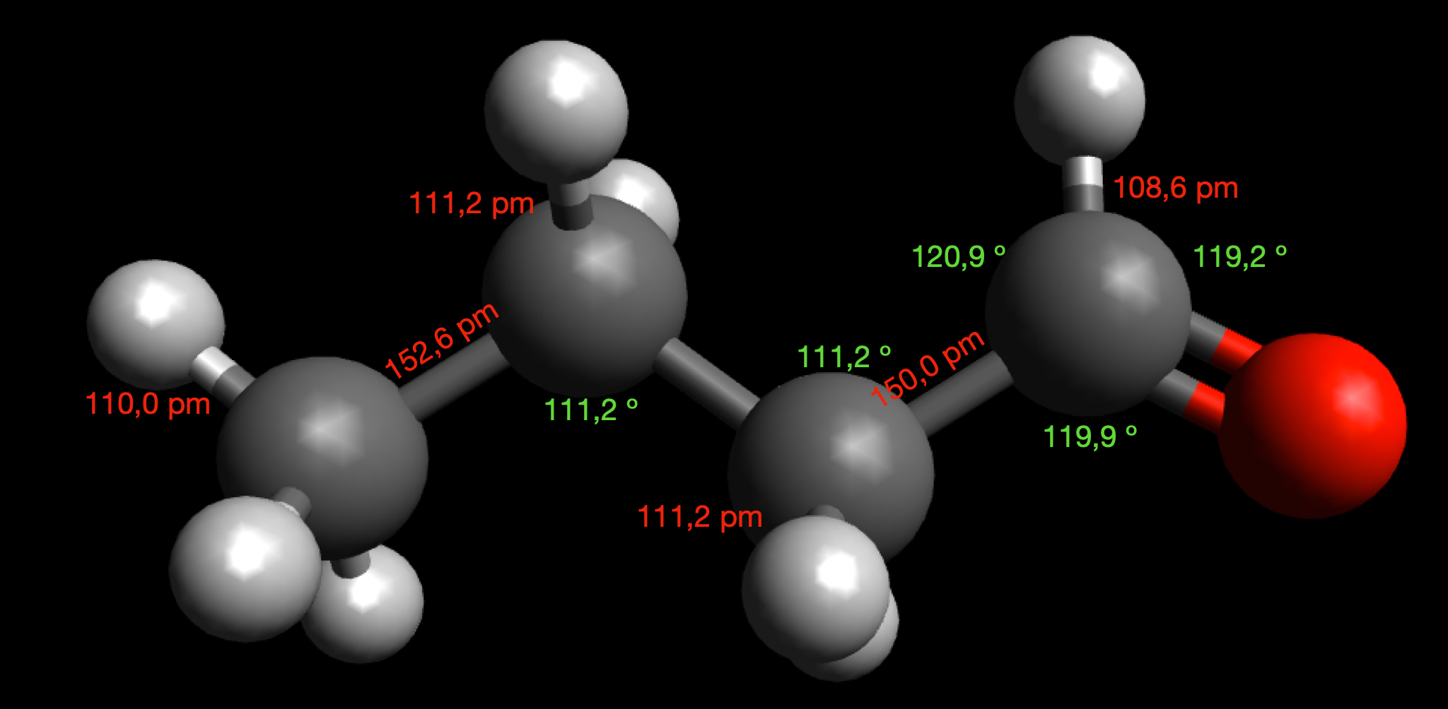 Die Bindungswinkel und Bindungslängen wurden mit der Messfunktion der Software Avogadro ermittelt, nachdem zuvor die energetisch günstigste Konformation erzeugt wurde.